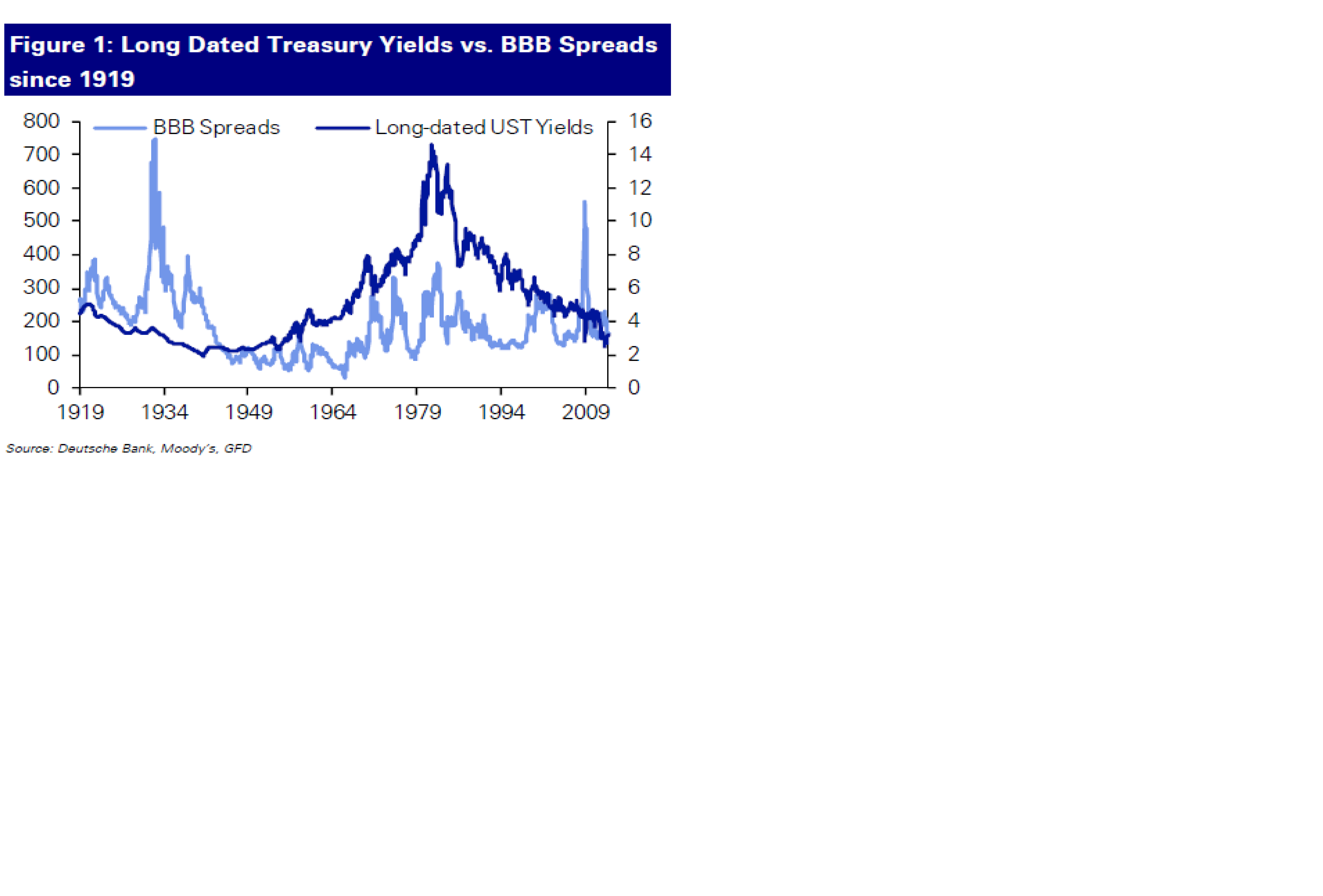 som ni ser har US statsobligationer spreadat mot BBB, typ företagsobligationer, med i snitt 200punkter +/- 200 punkter… oavsett om räntan är hög/låg, går upp/ner.