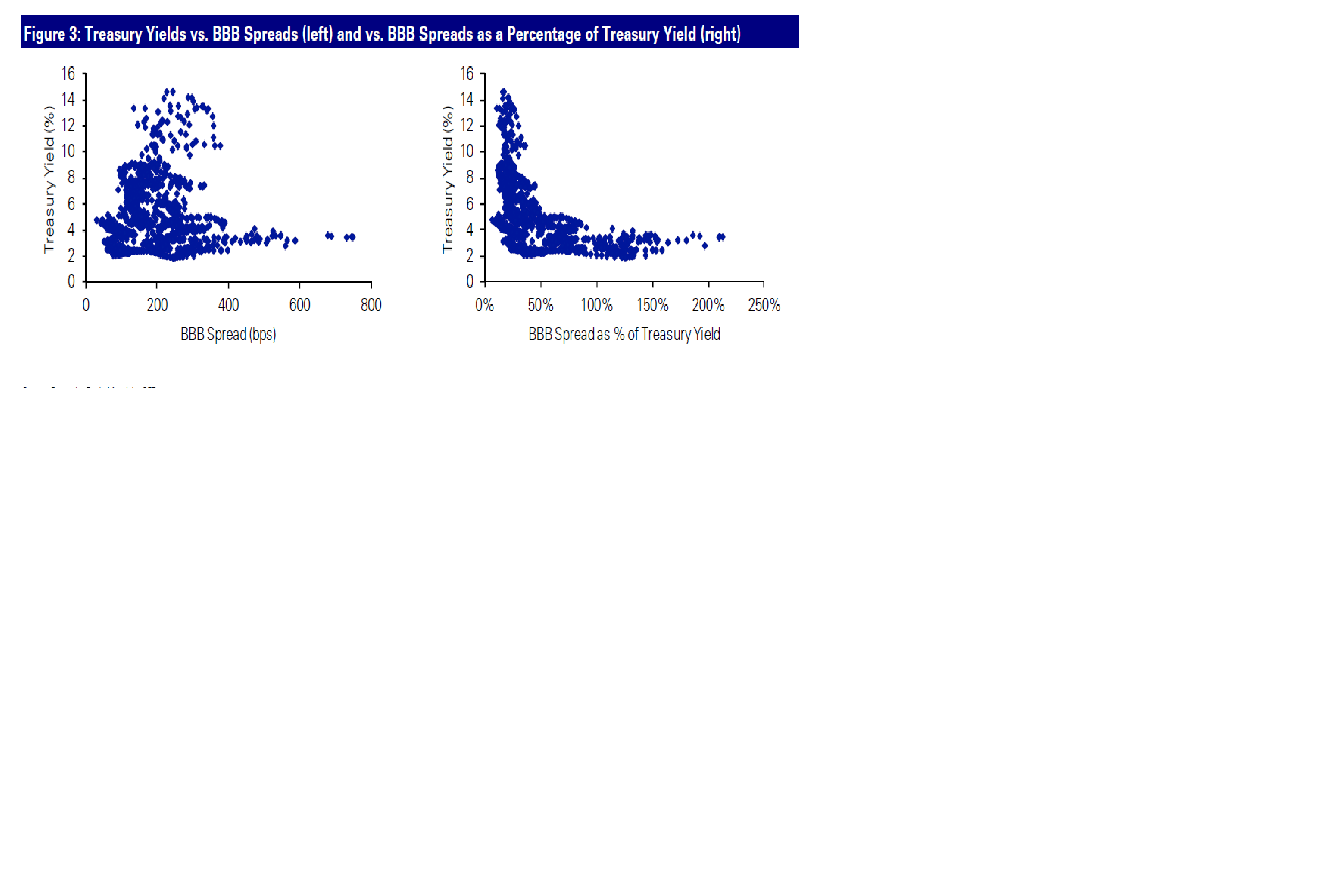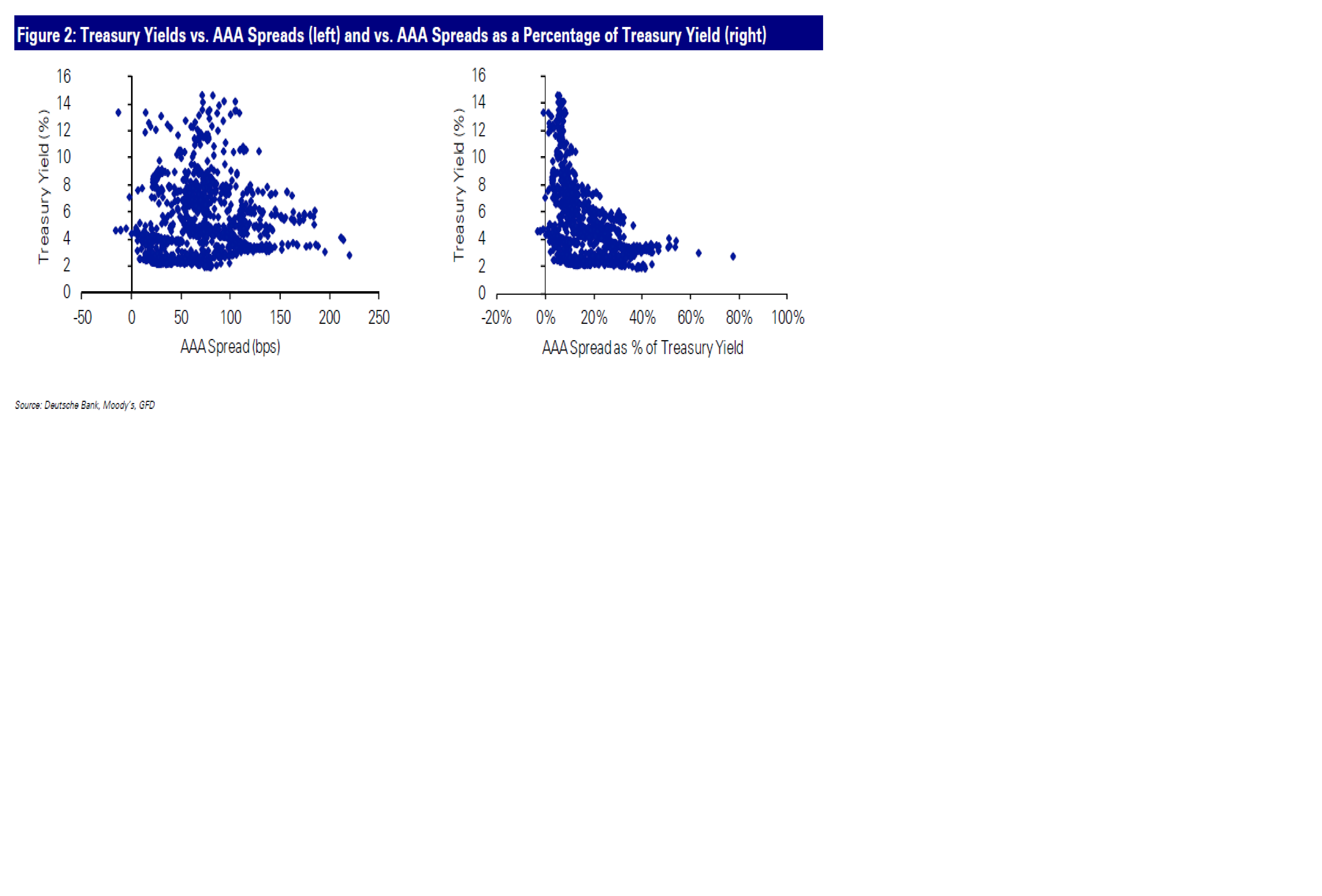 Tittar man på spreadarna mot AAA, dvs papper av hög kvalitet, finns det ingen koppling mellan spread och nivån på räntan. Dvs höga räntorn är inte lika med höga spredar!