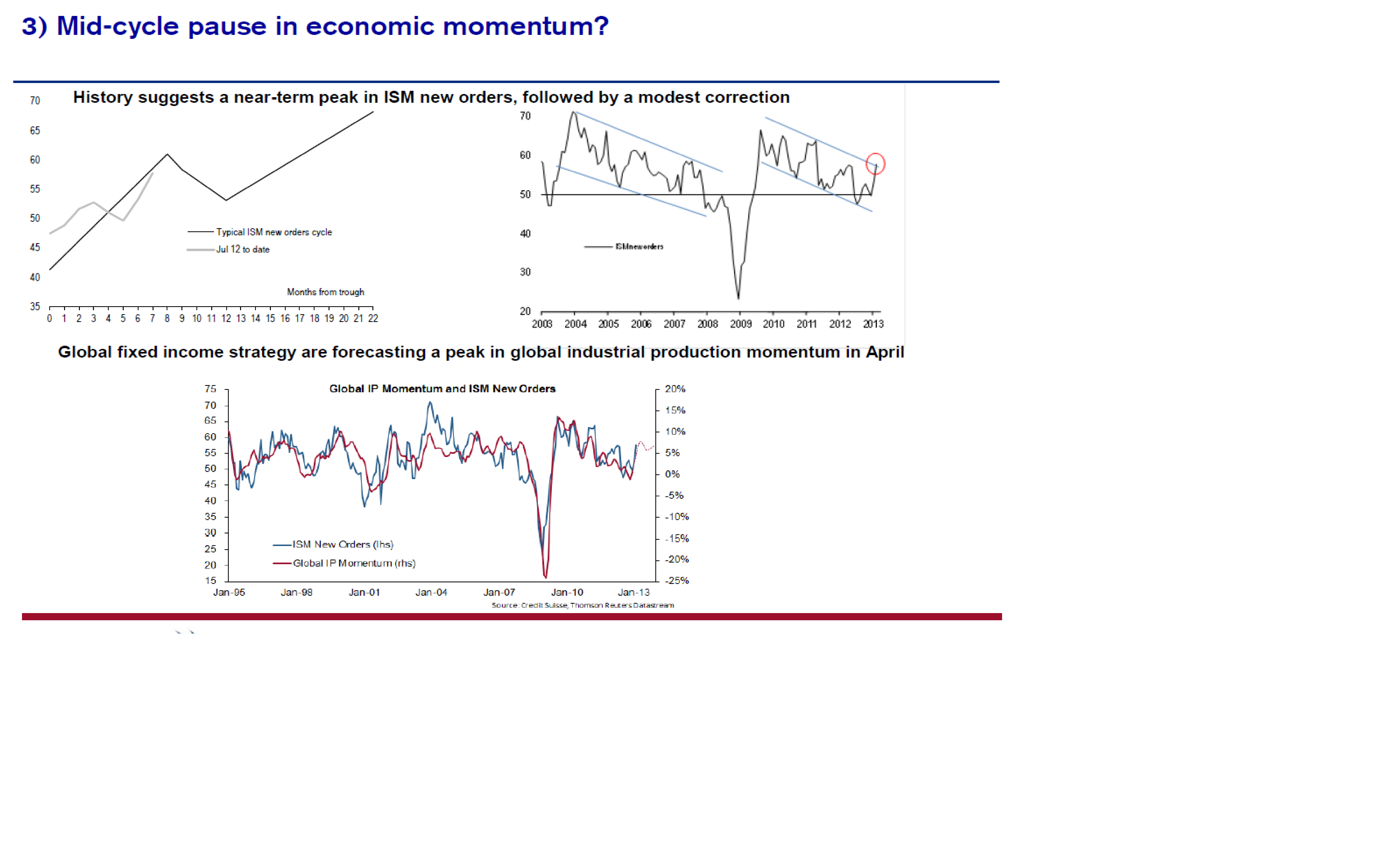 CS baissar också kring ISM, att den är på väg att toppa ur rent statisktiskt. BULLSHIT. Visst, de kan mycket väl få rätt, men att den ska vända ner här för att de dragit två streck.. lägg av! Det andra som gör mig sur är att den här typen av genomsnittslig historisk data aldrig blir exakt. ISM kan ha toppat ur vid förra siffran, eller med kommande juni siffra. De kommer ändå kunna peka på att de hade mer eller mindre rätt. Börsmässigt kan det skilja 10% upp eller 10% ner hur det blir. Alltså, den här typen av analys är svag då tajming biten i den är helt värdelös. Därmed inte sagt att de råkar få tajmingmässigt tur den här gången!