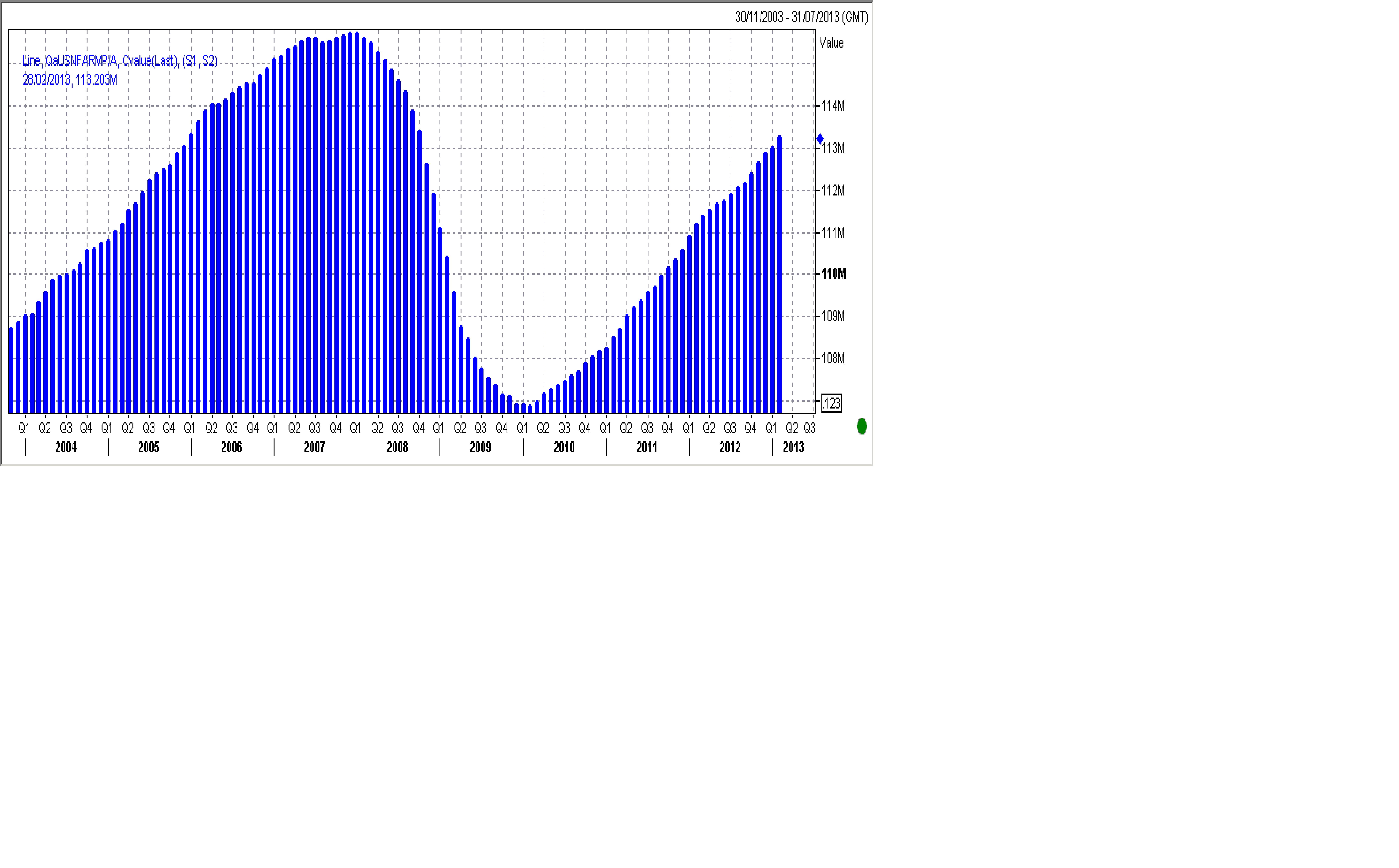 Jag har tidigare visat nedan chart. Det är Pay rolles i absoluta termer. Den siffran vi tittar på ovan är alltså en förändringssiffra. Vad säger den? Jo att antal amerikaner på officiell payroll, dvs som bär beskattningsbar lön, är den högsta sedan Lehman, och den har hela tiden ökat stadigt. Det är lika många som har jobb idag, som under 2006. Sen kan man alltid vara kritisk och säga att reallönerna har varit dåliga, att samma männsikor jobbar mer än man gjorde då, att workforce är större osv osv… men ändå. Det är också FLER jobb än år 2000, som var toppen på förra konjunkturen. Vi ska inte tappa perspektivet, det är det enda jag säger!