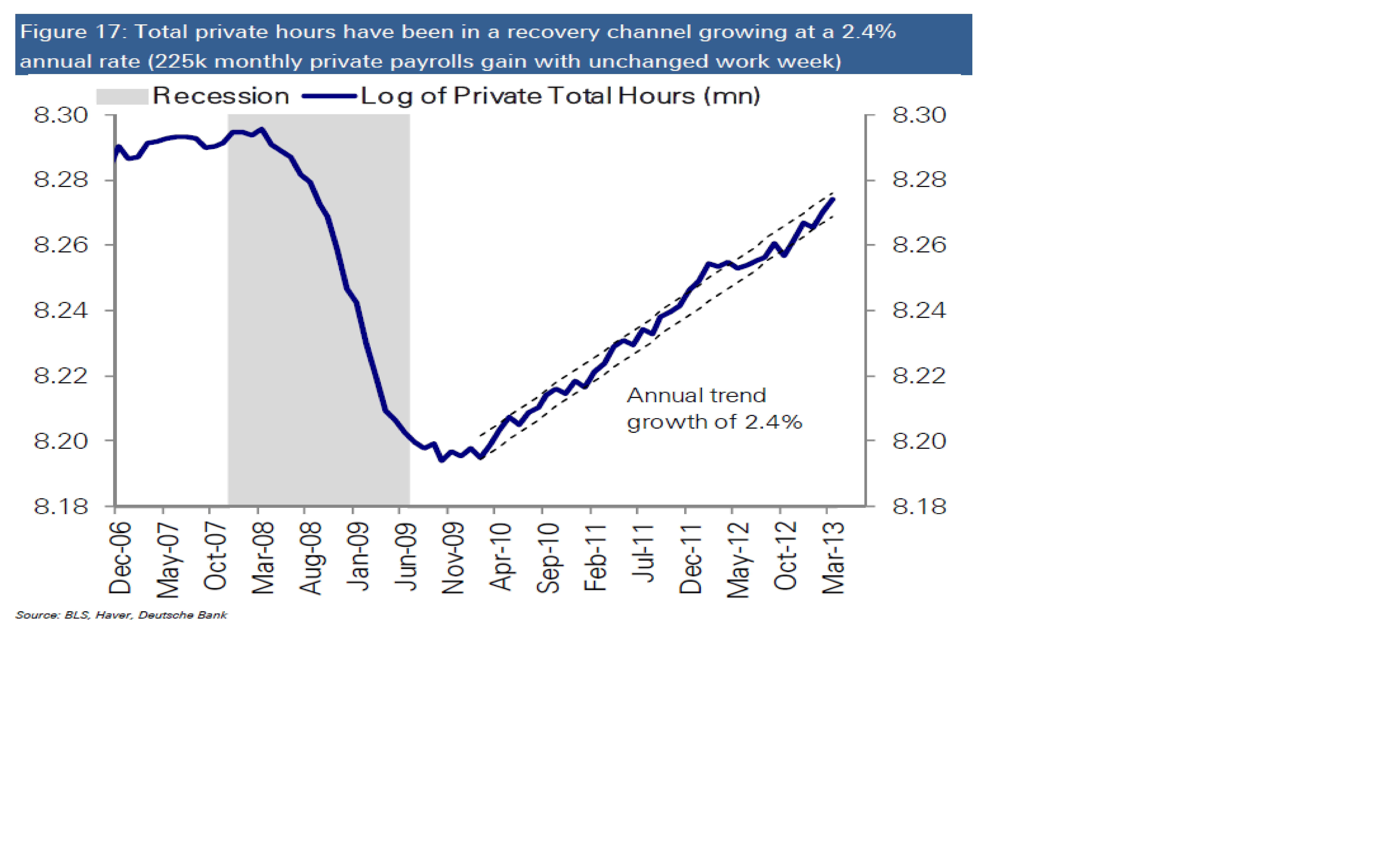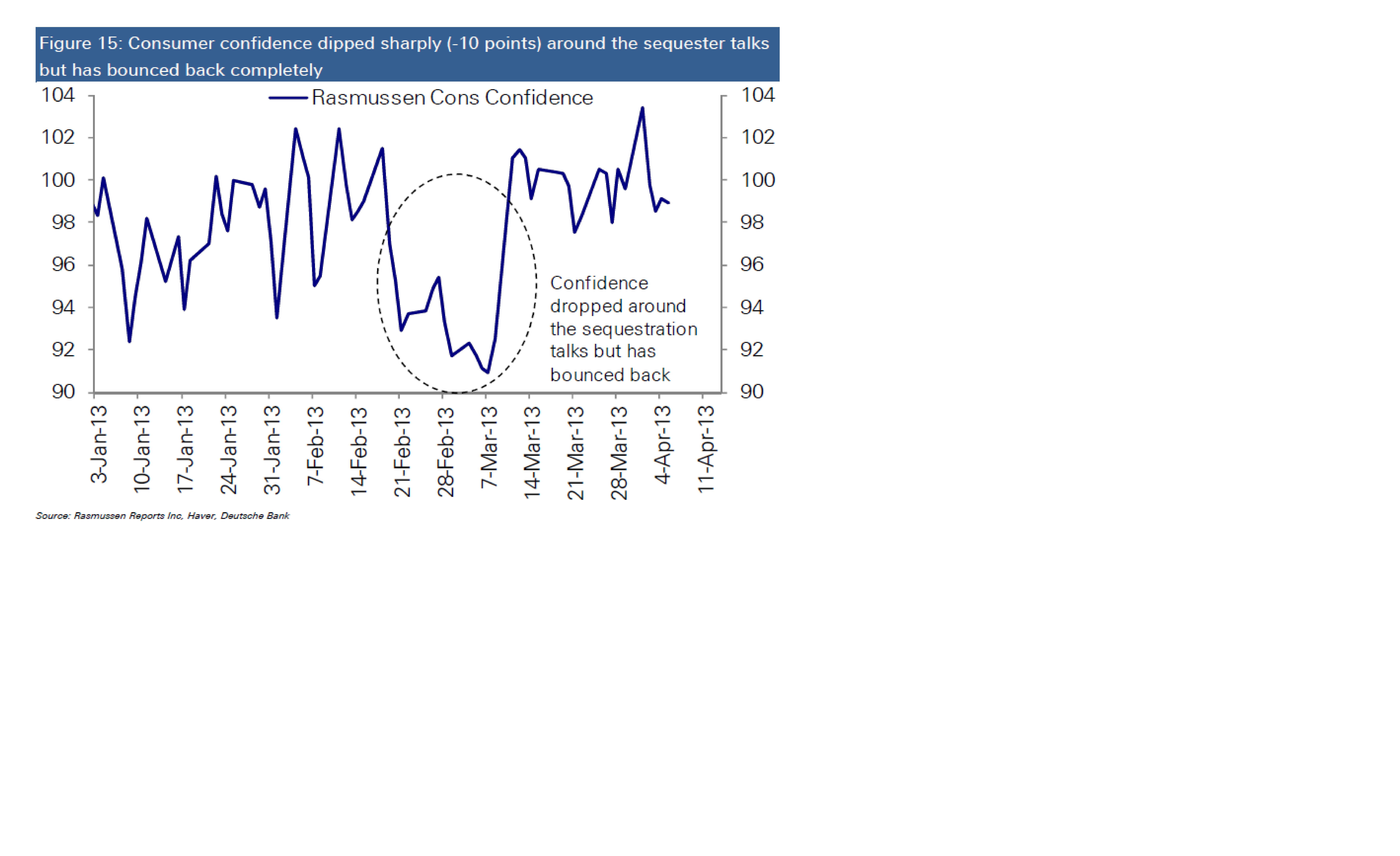 Faktum är att consumer confidence enl DeutcheBanks mätning helt har repat sig, efter att de fick en rejäl törn i slutet av februari i samband med att budgetuppgörelsen strandade i USA. Jag tror att just den här fick många att lugna sig i sina inköp och nyanställningar, men efter att röken lagt sig finns det potential för återhämtning. Detta skulle betyda att särskilt sentimentsindikatorer kan vända upp snabbare och kraftigare än kanske många tror…
