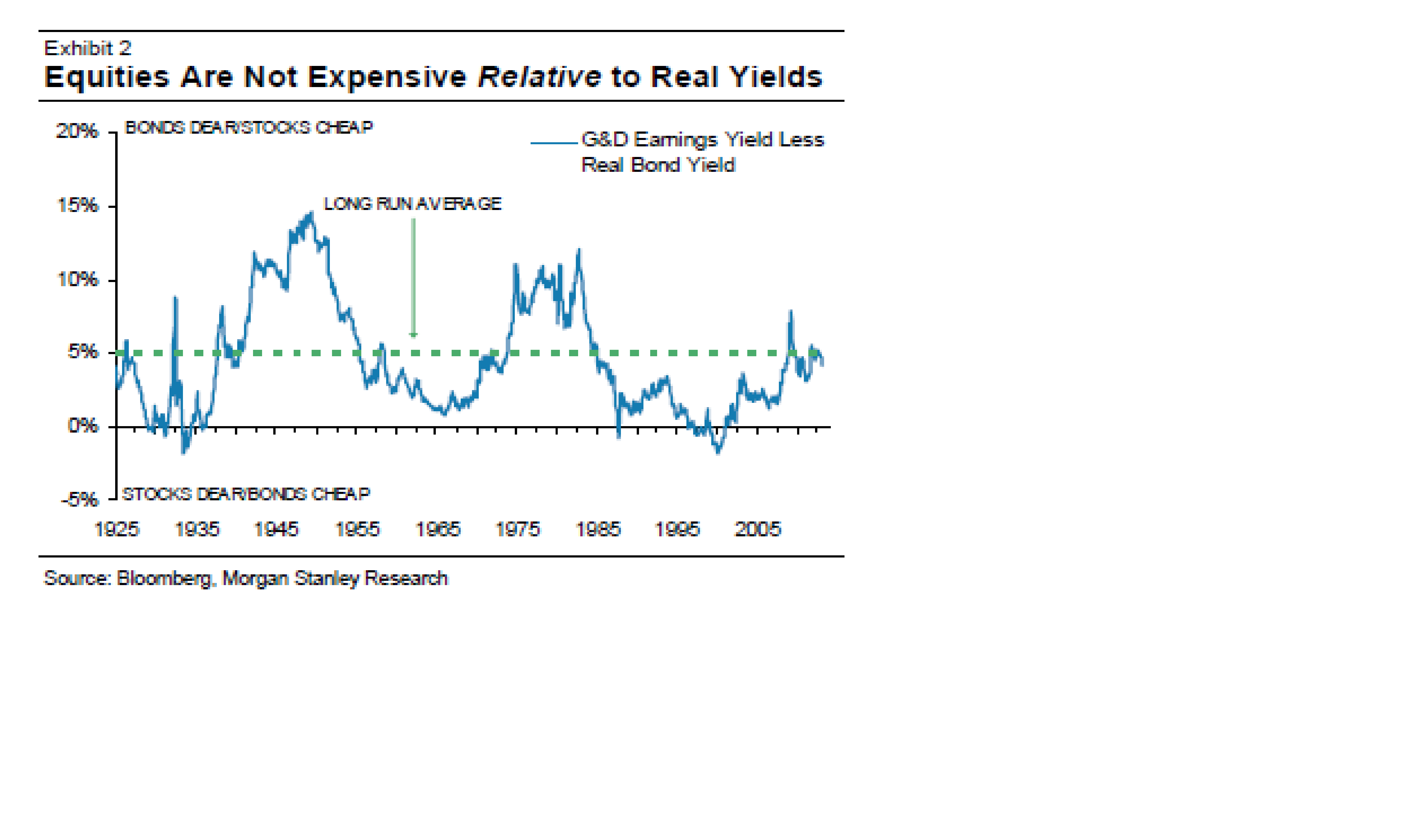 För alla dem med lyxen att vara långsiktiga så slår MorganStanley fast att aktier fortfarande är ganska attraktivt värderade. Deras mått, precis som mitt eget, är EarningsYield (dvs 1/PE) minus US 10yrs obligationen.