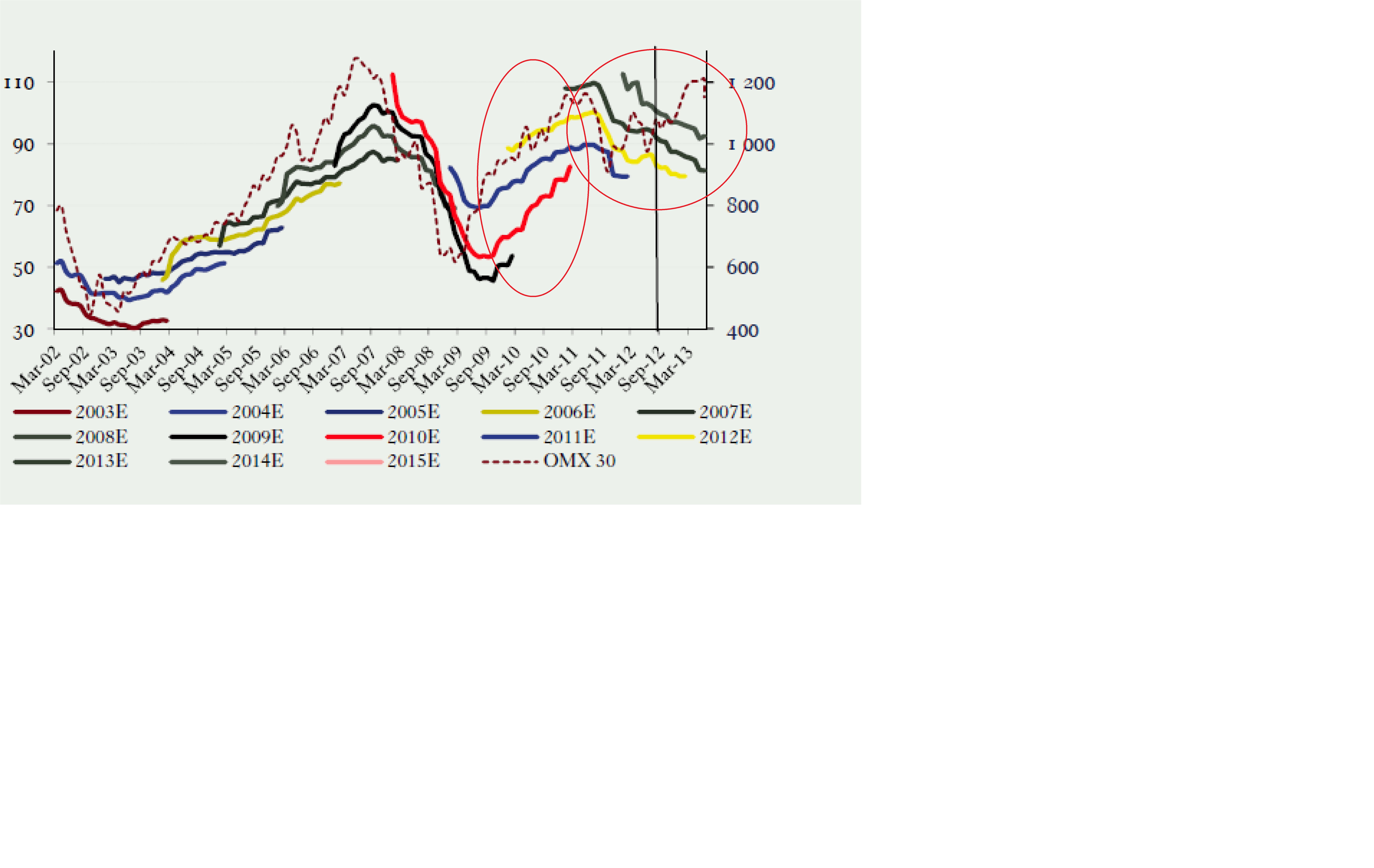 Nedan chart visar OMX och vinstrevideringar de senaste åren.