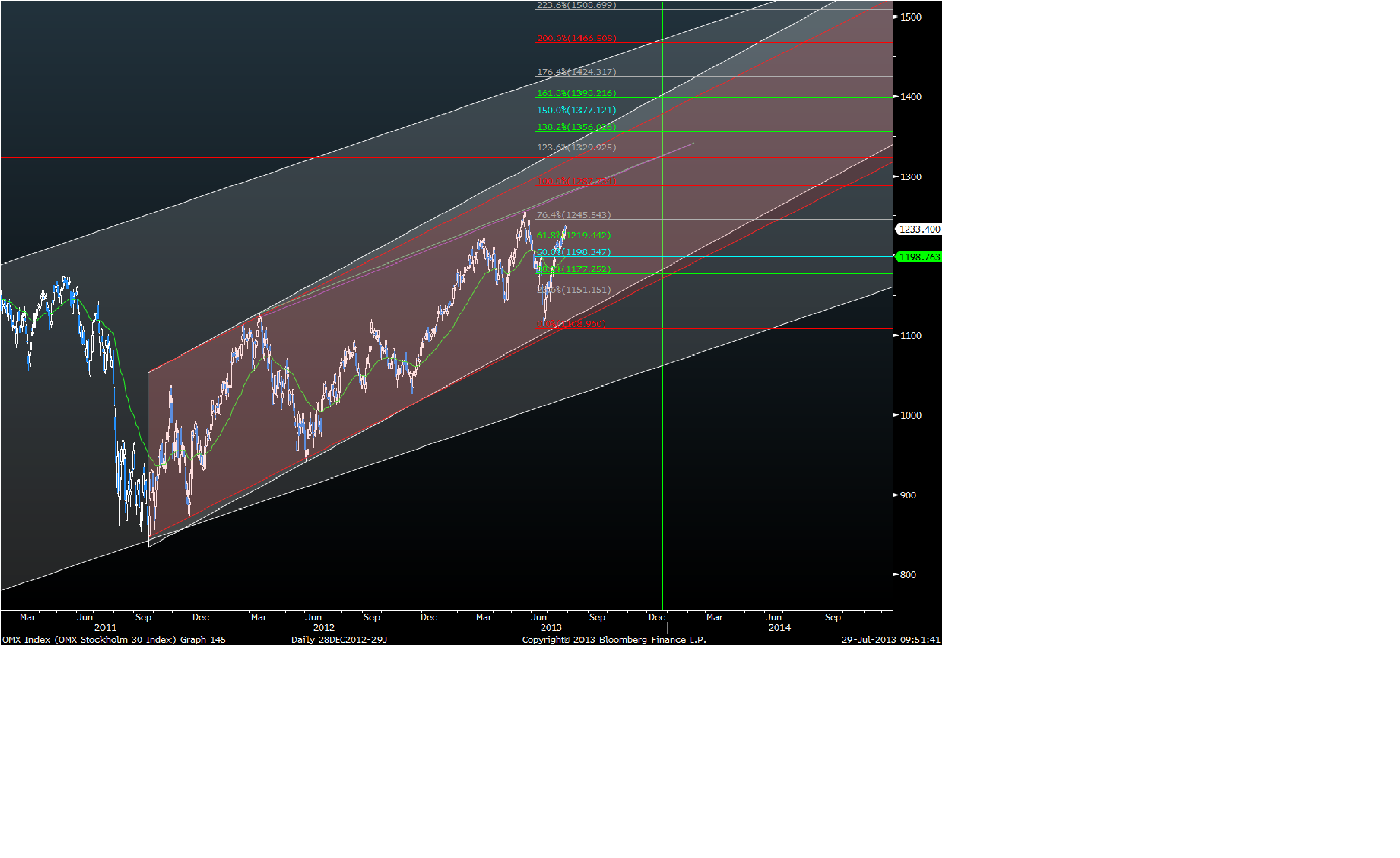 Börsen har gått tämligen starkt efter den starka jobbsiffran. Vi har ett motstånd i form av gamla toppen på 1257. Här lär det hacka till. På nedsidan har vi ett gap på 1155 som jag inte tycker är särskilt viktigt, däremot är gapet 1197 superviktigt, och kommer nästan garanterat att täppas till. Frågan är när och från vilken nivå. Håller 1257 och det vänder ner med kraft kan det gå ganska snabbt. Om vi bryter 1257 kommer nog många börja hoppas på 2007 toppen 1321, men det är kanske just därför vi inte når den direkt. Vid 1286 har du en intressant FIB50% nivån (1108-gapet 1197-1286). Kanske kan det vara nåt? Hursomhelst, om den ledande makron fortsätta att komma in ok och realräntorna håller sig på mattan samt vinstrevideringarna inte är negativa så kan vi nog testa 1321 senare i höst, och kanske passera den med nån procent. Men i det läget kommer också optimismen spira och det är dags att börja fundera över reträtt… mer om det längre fram. Sammanfattningsvis är det fortsatt positivt och buy the dips är att rekommendera.