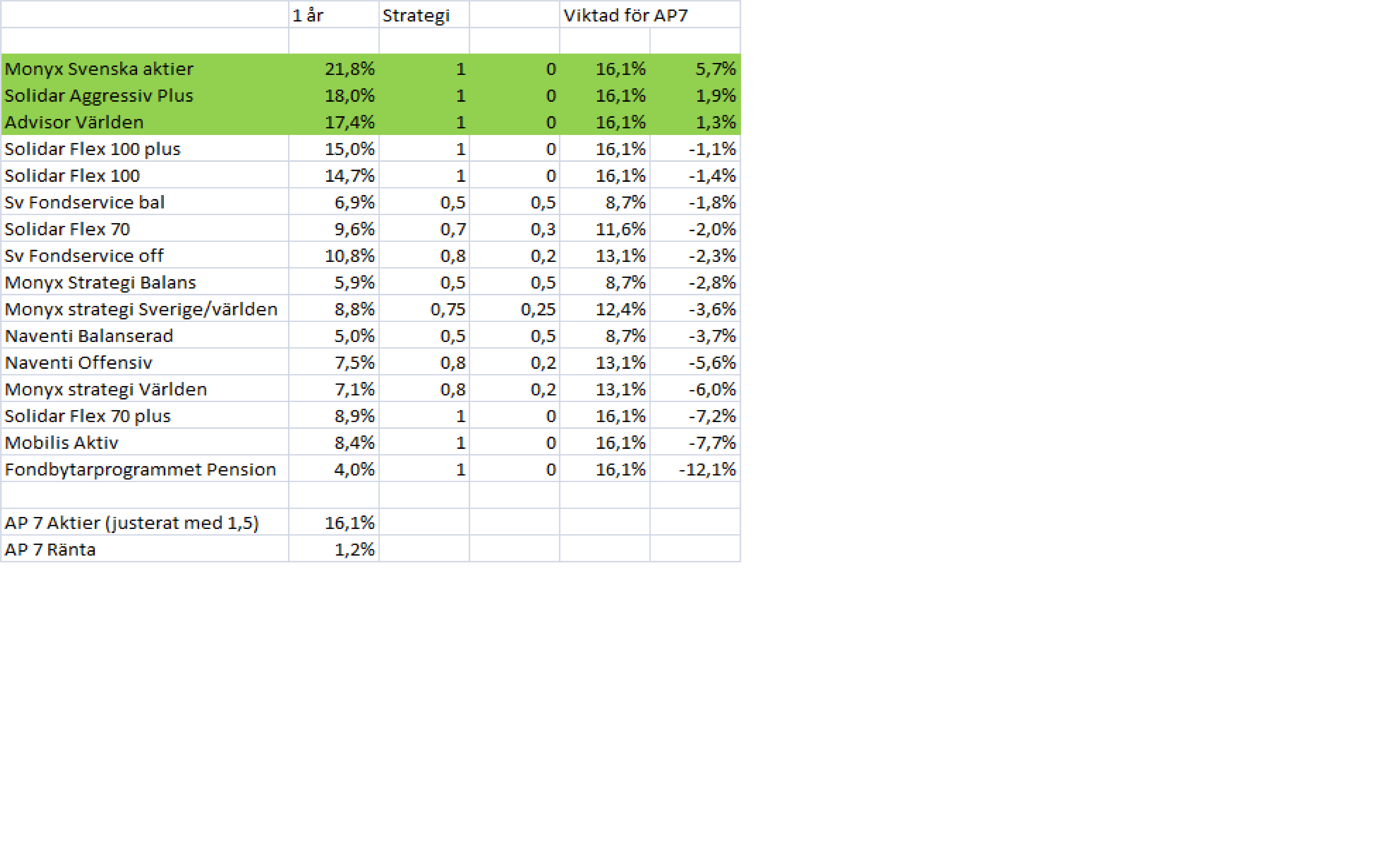 För att inte jämföra äpple och päron har jag också viktat avkastningen. En PPM fond som säger sig ha 70/30 som target vikt, så viktar jag likadant på AP7 fonder. Trots att fonden under året inte legat på 70/30 så får man ändå anta att förvaltaren avviker från target vikt utifrån marknadstro och en vilja att slå jämförelseportföljen.