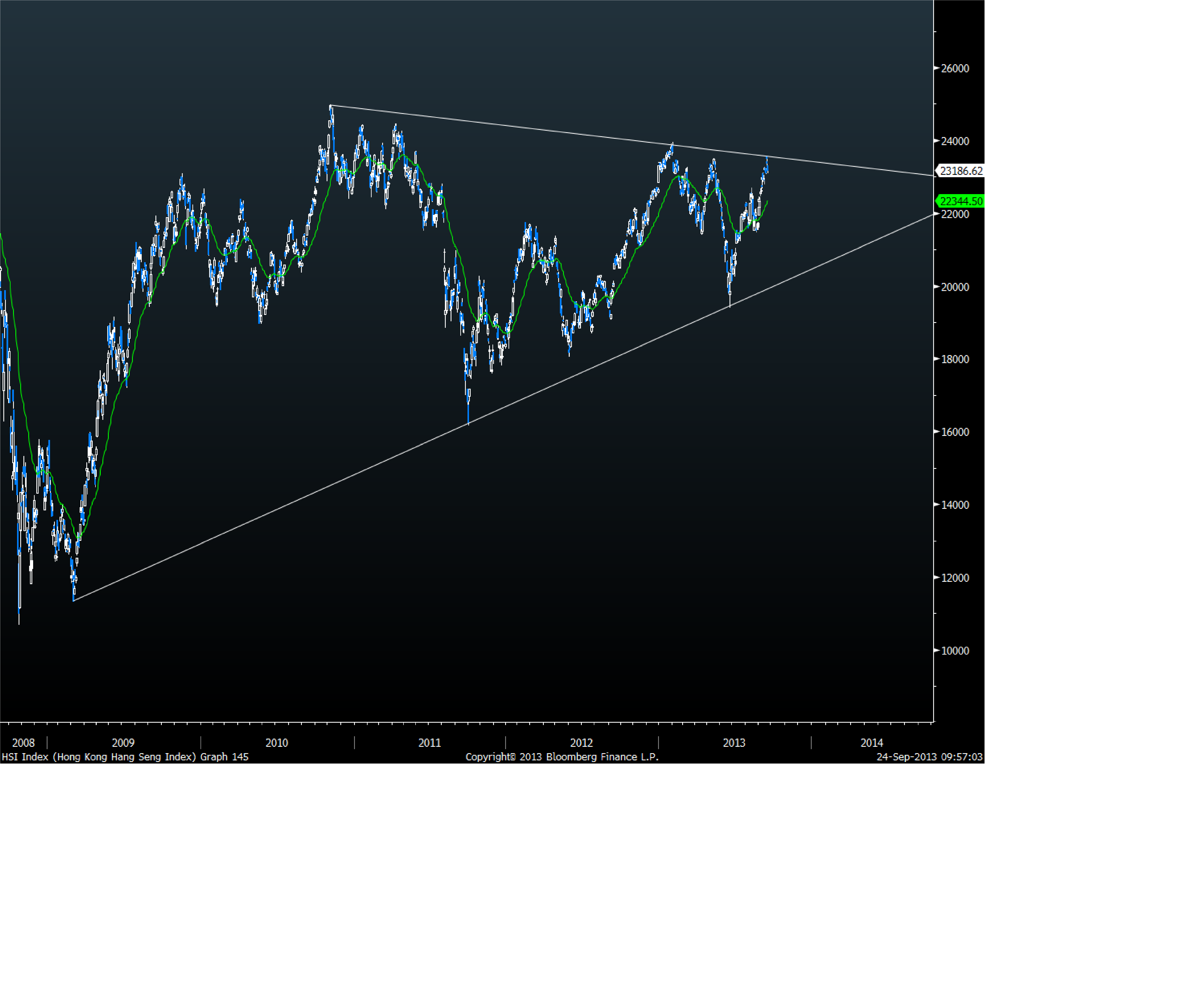 EM har gått ganska hyggligt sen i somras, men ur ett större perspektiv är vi flat sedan 4 år. Även innan uppgången sedan somras. HangSeng nedan illustrerar detta bra! Frågan är om vi ska bryta upp den här gigantiska konsolideringen. Svårt att säga, men när vi väl gör det så är potentialen minst 50% skulle jag säga, och klassiska DM marknader sannolikt underperforma. Men frågan är som sagt NÄR, och idagsläget skulle vi lika gärna kunna ”mean revert” en ca 10%. Visst, exponeringen bland det utländska kapitalet är låg, värderingarna låga, vinstrevideringar varken från eller till… men det räcker liksom inte. Det krävs nåt mer! Min gissning är att det har att göra med förväntad vinsttillväxt. De senaste 4 åren har BNP vuxit betydligt snabbare för BRICS jmf DM…. MEN tittar man på vinsterna har DM bolag varit bättre. Det är ganska anmärkningsvärt. Detta handlar om många saker, dels har löneinflationen varit noll i DM, dels har räntorna varit obefintliga samtidigt som man amorterat. DM har haft nästan deflation, samtidigt som EM från tid till annan haft en kostnadstryck som man inte kunnat kompensera sig för. Det finns många anledningar. Men tids nog borde kopplingen Nominell BNP—Nominell Sales—ökade vinster börja fungera igen… och då tror jag det är dags för EM igen, på bekostnad av DM.