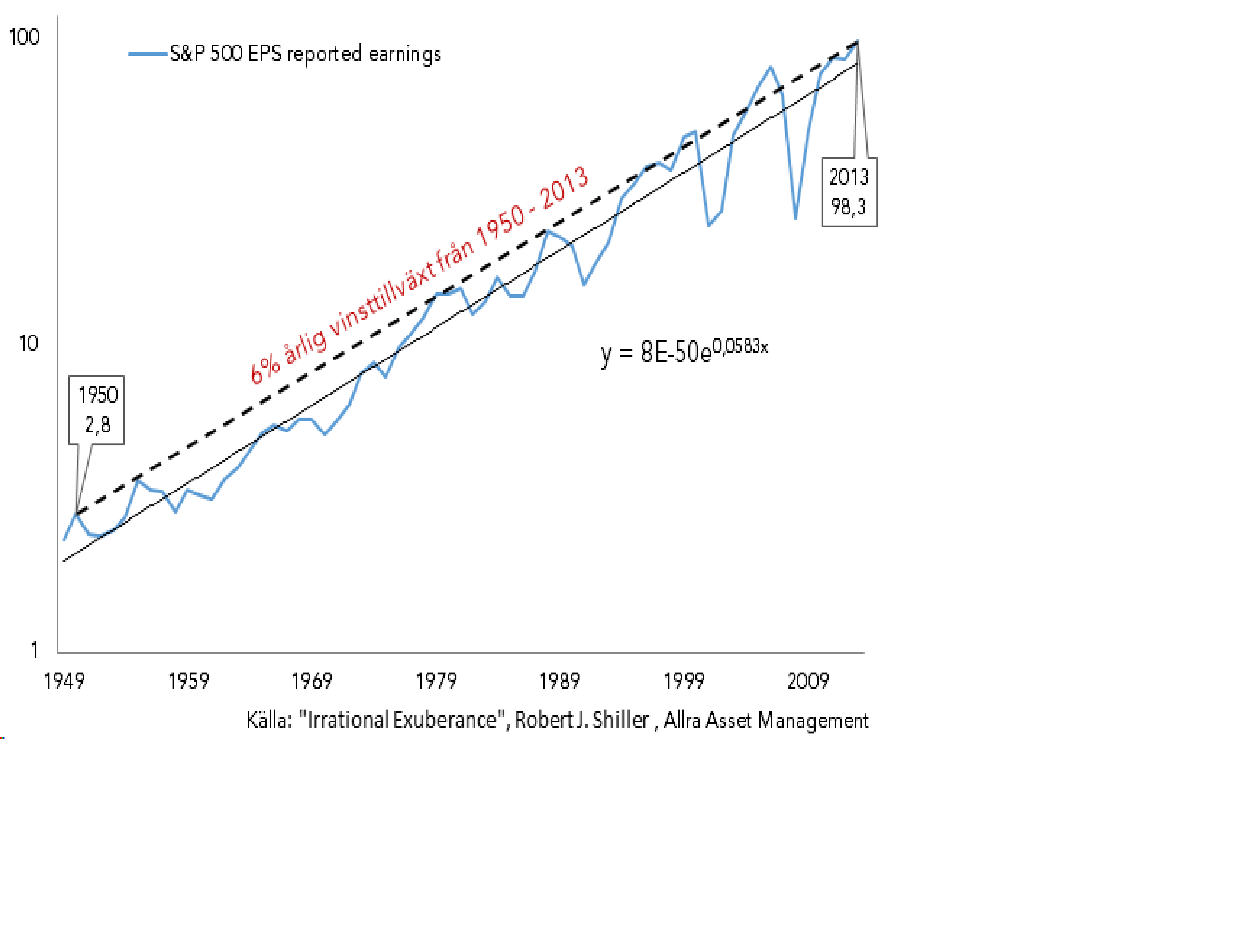 Nedan är SPX vinstutveckling sedan 1950….. det stiger med ca 6% per år. På ett enskilt eller ett par år kan det diffa rejält men över en 10 års period kan du vara tämligen säker på att 6% vinsttillväxt genereras. Den går i sin tur att härleda till nominell tillväxt i en ekonomi, samt att oproduktiva företag slås ut m.m….