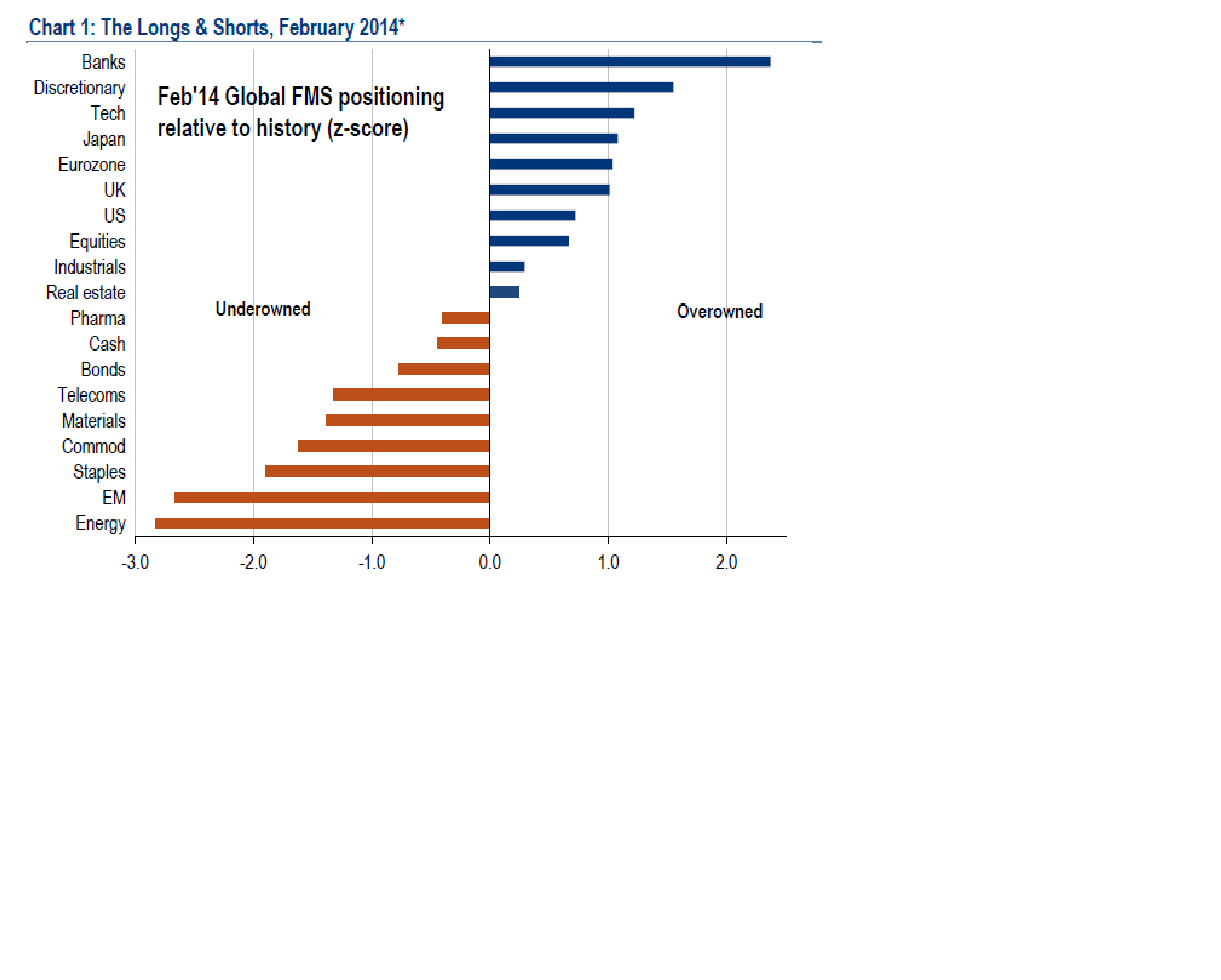 Jag ser två tolkningar. Antingen betyder det att vi har en rekyl runt hörnet som kommer medföra att ”marknaden” haft rätt i att ta upp kassan, och det som väntar är ytterligare stigande kassa under själva rekylen. En rekyl man då ska köpa i! Alternativt betyder det att den senaste uppgångsfasen gynnat väldigt få, och om det fortsätter att stiga, så kan cash på sidolinjen bli stressad, och söka sig tillbaks in i aktier och pressa dem betydligt högre än vad vi idag kan vänta oss, och det är inte förrän den här kassan har sjunkigt till ”contrarian sell” nivåer som vi egentligen ska hoppa av aktier. Vilken är det? Tja jag vet faktiskt inte men hittills bettar jag på det förstnämnda, då läget generellt sätt är bullish, dvs man är överviktad aktier vs bonds (vilket man förvisso varit extremt länge), cykliskt vs defensives, small cap vs large caps och risk traden faktiskt inte är EM, utan Europa, och det är när vi får se en knäck därifrån som sell offen tar vid. Varför blev inte EM risk/beta traden… tja för att investerare generellt sett ser EM, och Kina i synnerhet, som den största riskfaktorn mot den globala ekonomin. Däremot alla unisont positiva till Europa.. tills förväntningarna inte infrias?