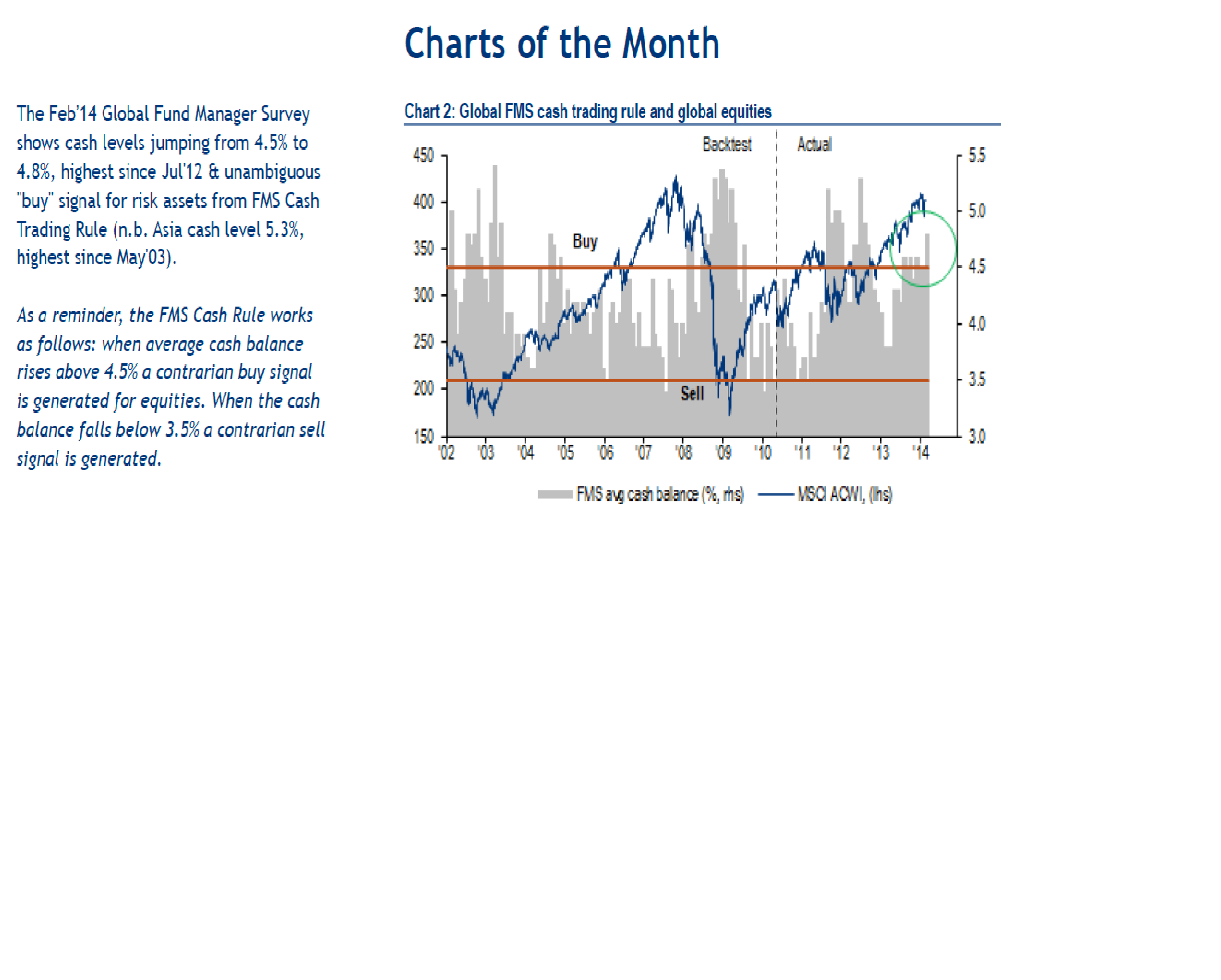 Annars är nedan chart det som besvärar mig mest. Det visar på att Cash nivåerna har letat sig upp på en nivå som brukar föranleda contrarian köp. Detta är en indikator jag faktiskt tittat mycket på historiskt, och den har faktiskt haft ett info värde. Men nu är det lite stökigt, då kassanivån faktiskt gått upp på en hög nivå samtidigt som börsen också klättrat. Det brukar vara tvärtom. Kassannivån stiger när börsen korrigerar… kassanivån sjunker i takt med att börsen stiger. Hmm, va betyder detta?