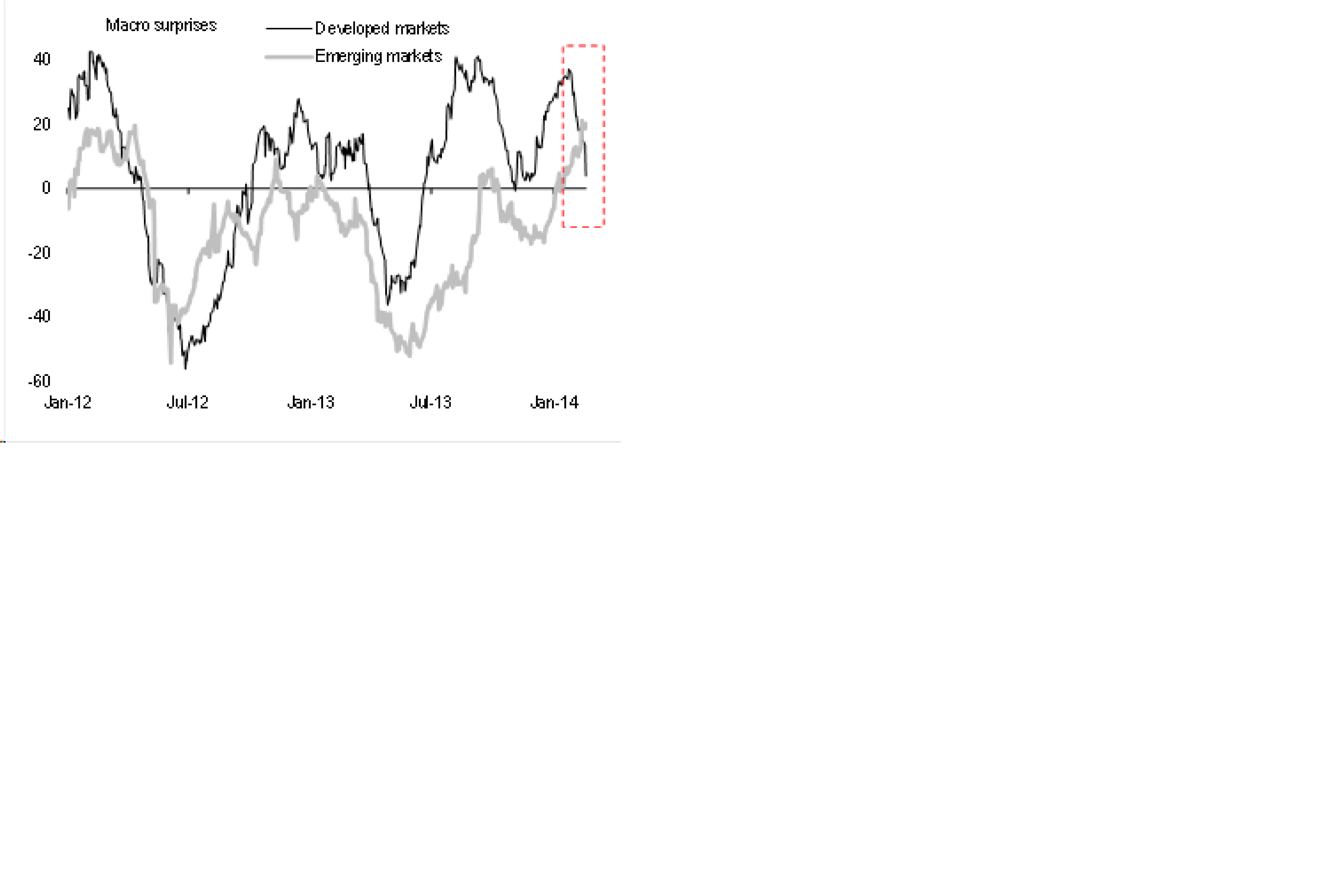 Jovisst har ISM, NFP mfl inte varit så stark på sistone och mycket riktigt har surpriseindex vänt ner för DM. EM däremot har inte gjort det! Det intressanta är att DM börserna handlas inte långt från sina toppar medan det har surnat till rejält i EM. Normalt sett så har faktiskt spreaden mellan DM/EM surpiseindex en ledande effekt på den relativa avkastnigen. Normalt sett borde EM alltså outperformat DM sedan datan började komma in sämre. Men det har den alltså inte gjort. Vad beror detta på? Jo, Ukraina, Argentina, Turkiet, Kina mfl anses vara de största riskfaktorerna i världsekonomin. Med all rätt, om man tittar på vad som händer i Kiev… MEN, the big MEN, om den turbulensen lägger sig och inte får några spridningseffekter globalt, samtidigt som den ekonomiska datan fortsätter att komma in OK i EM… ja då tror jag att dagens nedgång tar oss ytterligare ett steg närmare ett köpläge ur ett lågsiktigt perspektiv.