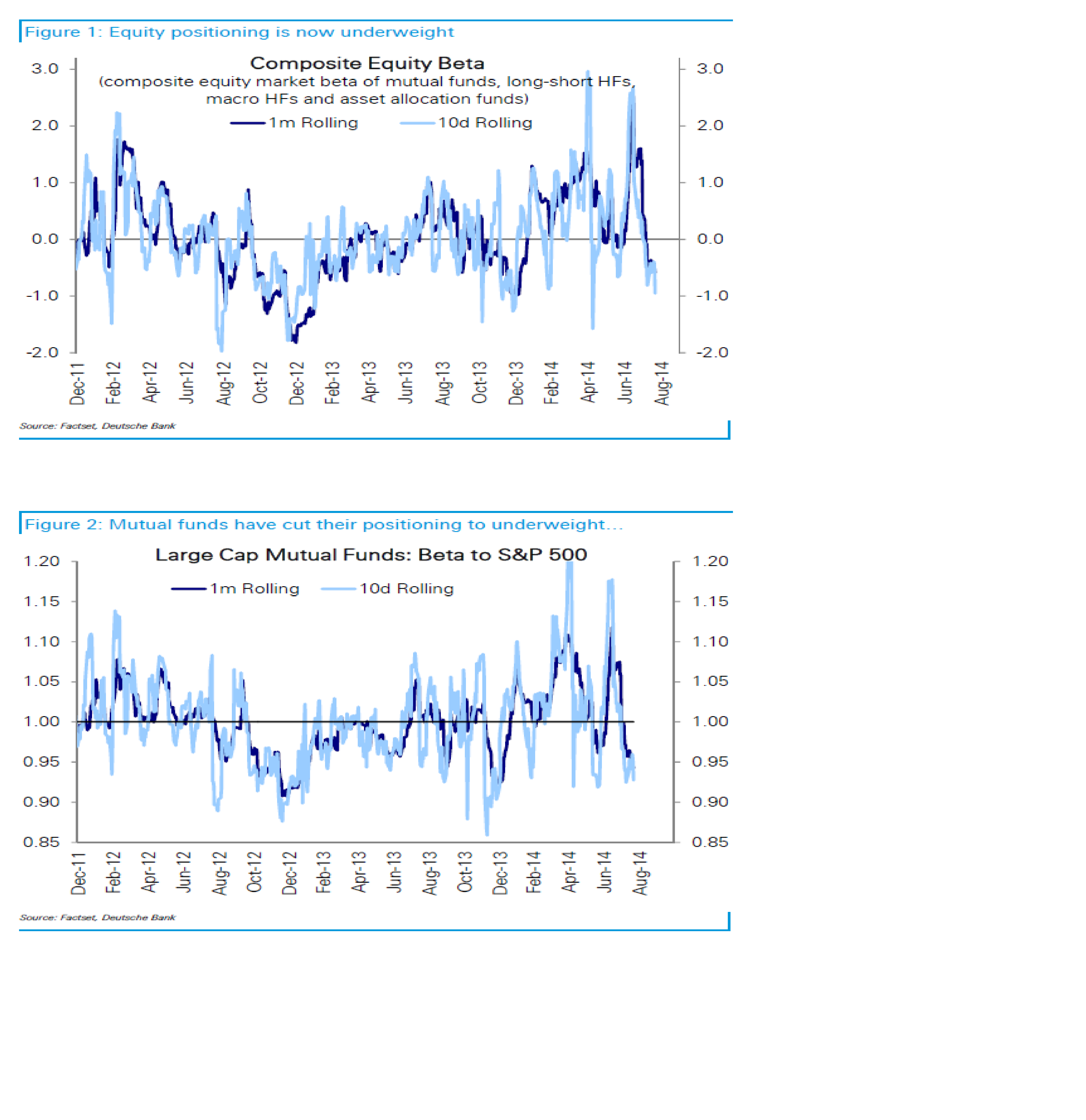 Senaste datan pekar på att fonder generellt hade ett väldigt högt beta i somras, innan korrektionen. när den infann sig var de snabba på att sälja. Det intressanta är att studsen i marknaden senaste veckorna inte har kommit ifrån kraftiga inflöden. Det säger dessvärre inget om den framtida utvecklingen mer än att skulle uppgången fortsätta så är det många som står utanför och känner sig stressade, vilken på så sätt kan förlänga och förstora uppgången. Om det tvärtom vänder ner så är det redan många som står utanför vilken skulle kunna begränsa nedgången.