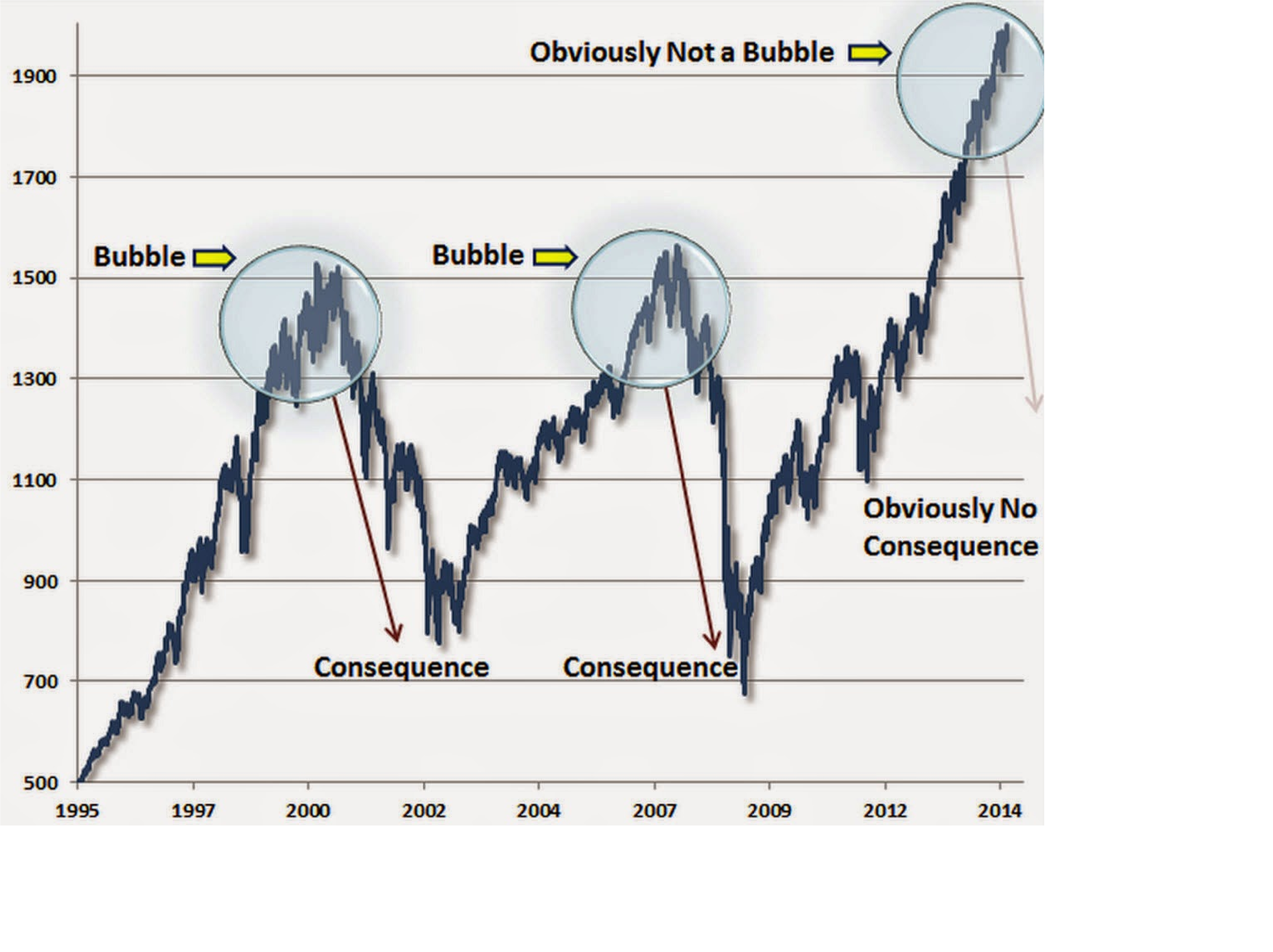 Nedan chart brukar man se från tid till annan. Låt oss vara på det klara att aktier går inte ner bara för att det gått upp. Men för att de ska kunna falla kraftigt brukar de ha stigit mycket innan!