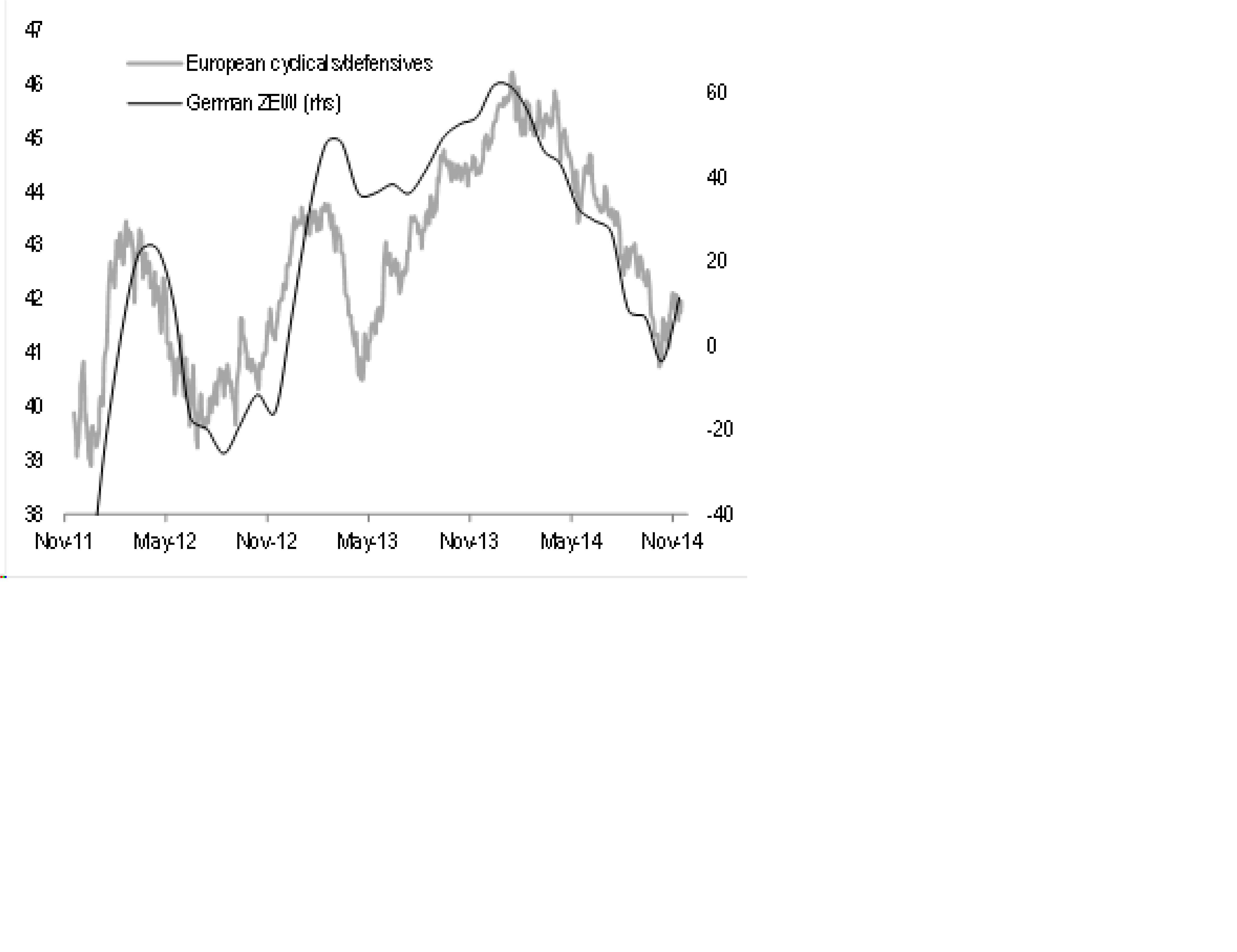 Det är ju alltid frestande att leta efter halmstrån när något gått dåligt… som ex Svenska cykliska bolag. Tyska ZEW index har en viss korrelation med rel traden mellan cykliskt och defensivt… och den har studsat. Måste säga att jag är lite kritisk till ZEW index då tyska börsen ingår i index. Börsen leder ju inte börsen 🙂 Men ändå, Simon Blecher var ute idag och sa att Sandvik och Volvo är kanske börsens billigaste storbolag. Han är i varje fall påläst…. sen har inte han någon spåkula heller. Men tanke frestar…