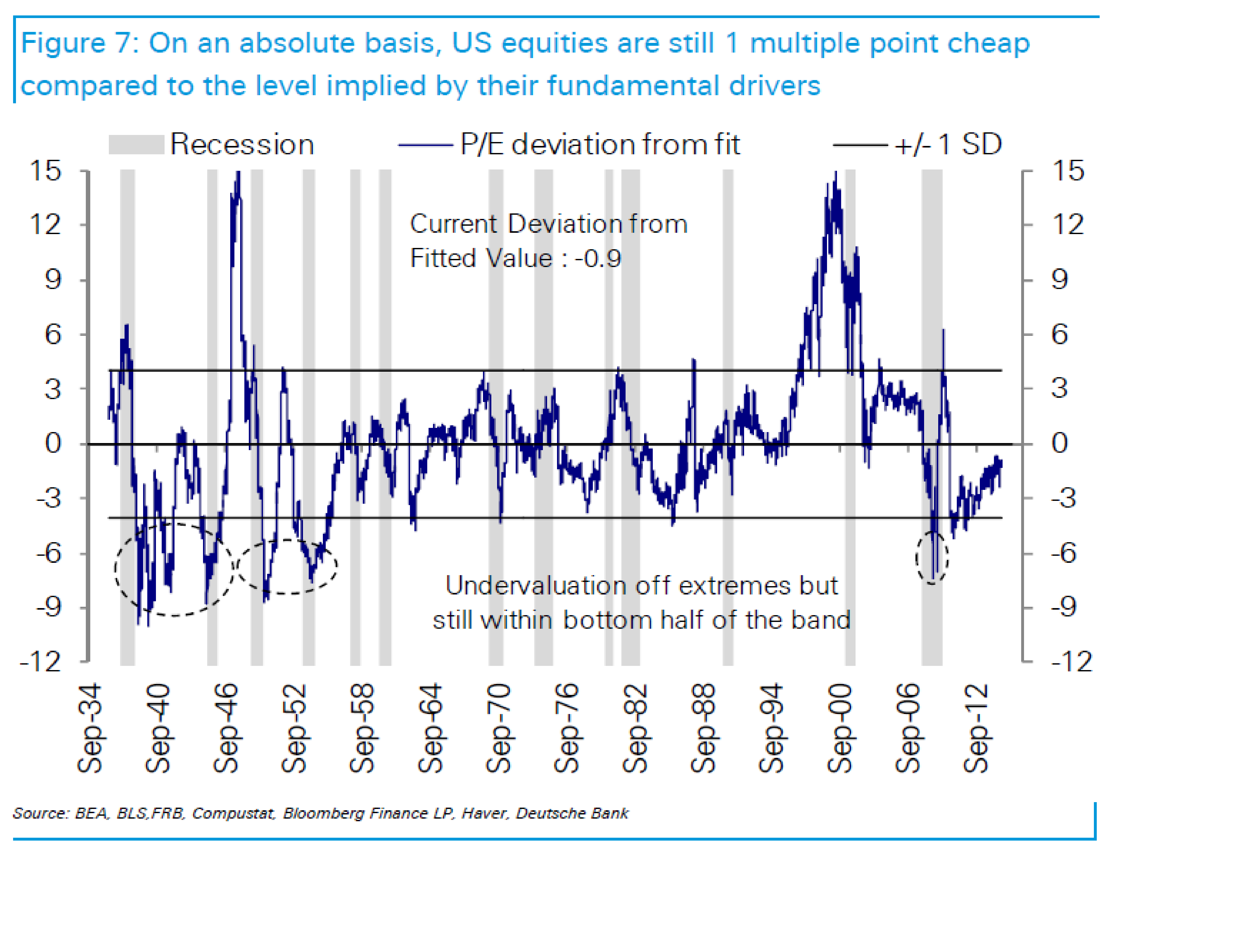 Är SPX dyrt? Tittar man på DBs regressions modell så är den inte det. Strax över neutral värderat, och en bit kvar till sk. Fitted value, och till tidigare toppar (ex Millenium bubblan)