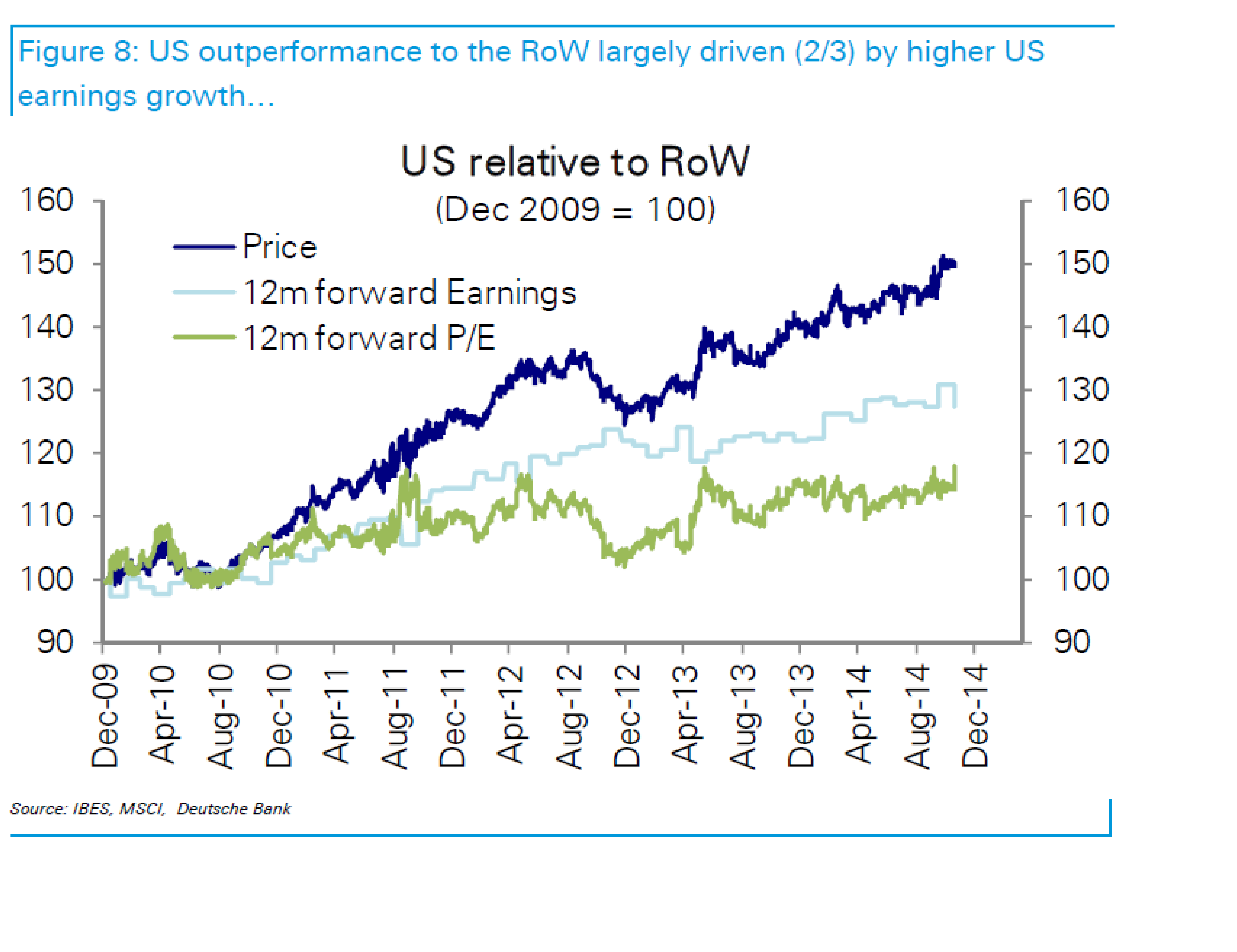 Detta är intressant tycker jag. RoW står för Rest of the World. USA har alltså outperformat resten av världen med över 50%, vilket alla känner till! Men vinsterna har också outperformat, nämligen med ca 30%. Med andra ord är 2/3 av outperformance vinstrelaterat, och 1/3 multipel relaterat. Vinsterna har till stor del handlat om marginaler. USAs marginaler är fantastiska, och härstammar från låg löneutveckling, låga räntekostnader, låga avskrivningskostnader, men också hyfsad sales ökning (det senare rel Europa).