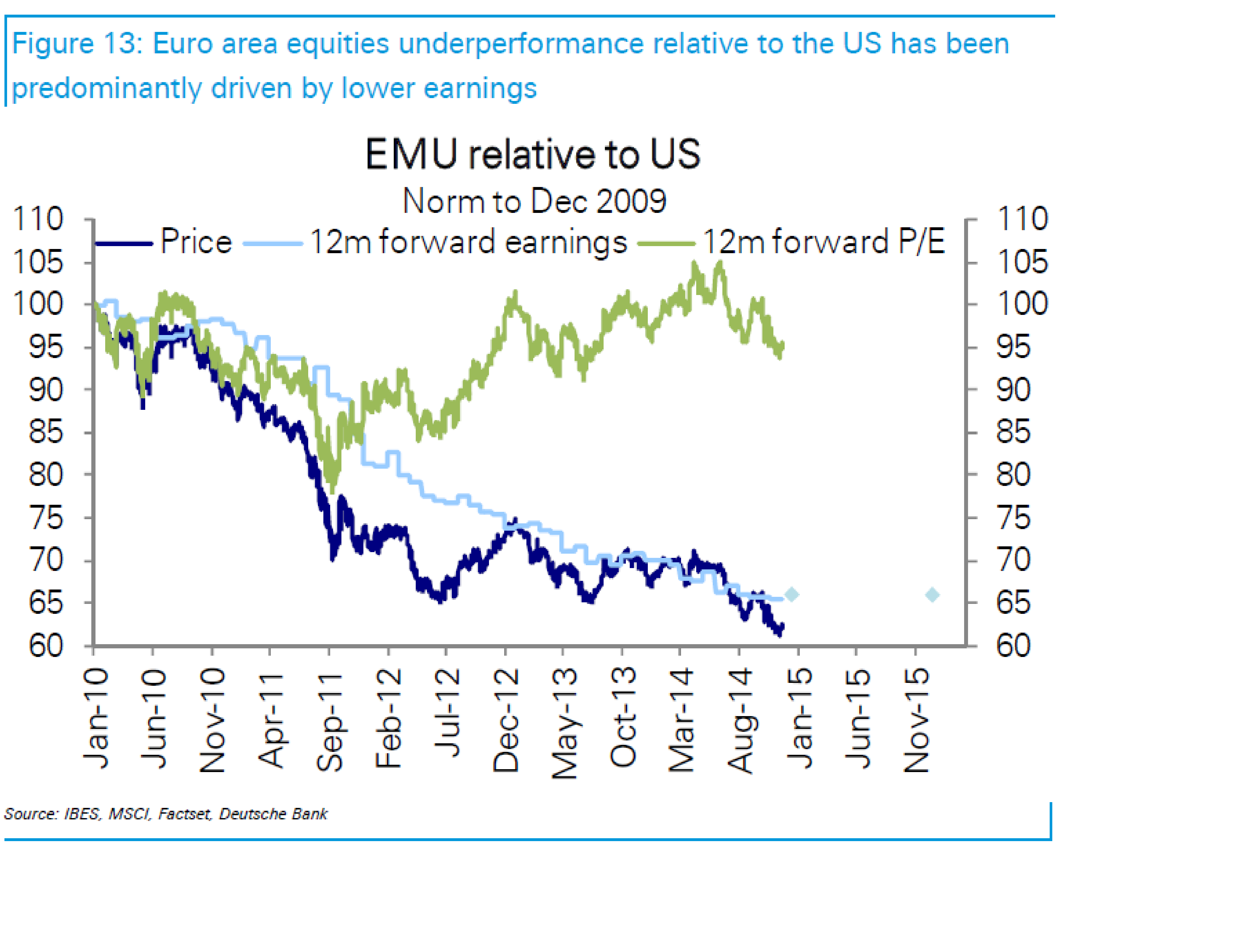 Även tillväxtmarknader har gått dåligt. Vinstutvecklingen förklarar inte så mycket här. Den ligger strax efter USA (trots att top line varit så mycket starkare, alltså har marginalerna pyst ihop!). Nej den stora grejen här är de rating av multiplar jmf med USA. Sen kan man alltid hävda att multiplarna var för höga kring 2009, och mycket riktigt har ju inte nominell BNP tillväxt gått i samklang med vinsterna, och därför har ju marknaden haft rätt i att den inte ska vara så högt värderad.
