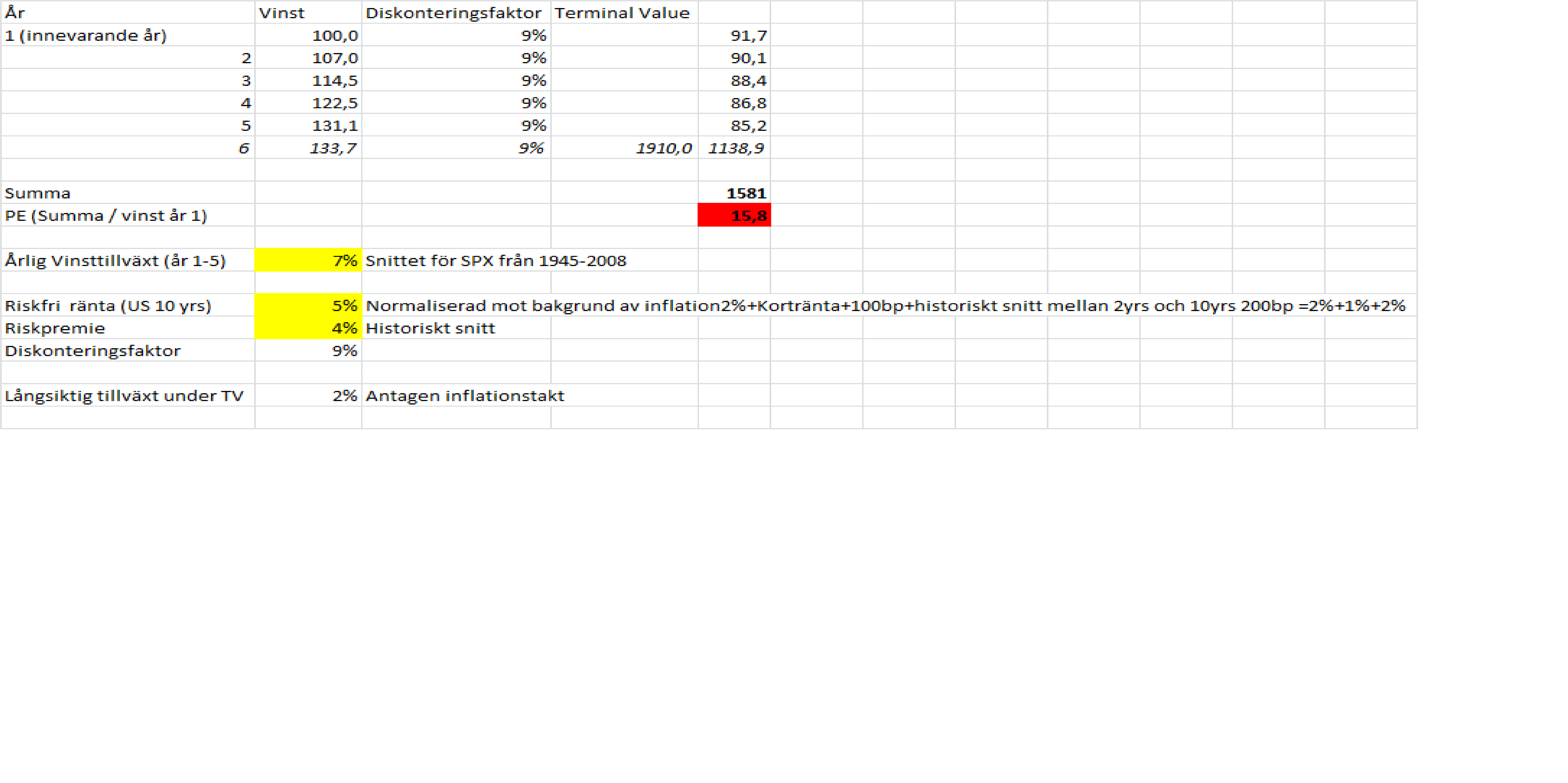 Om man gör detta får man fram PE 15,8. Visst modellen är förenklad men det är ingen slump att detta är historiskt snitt.