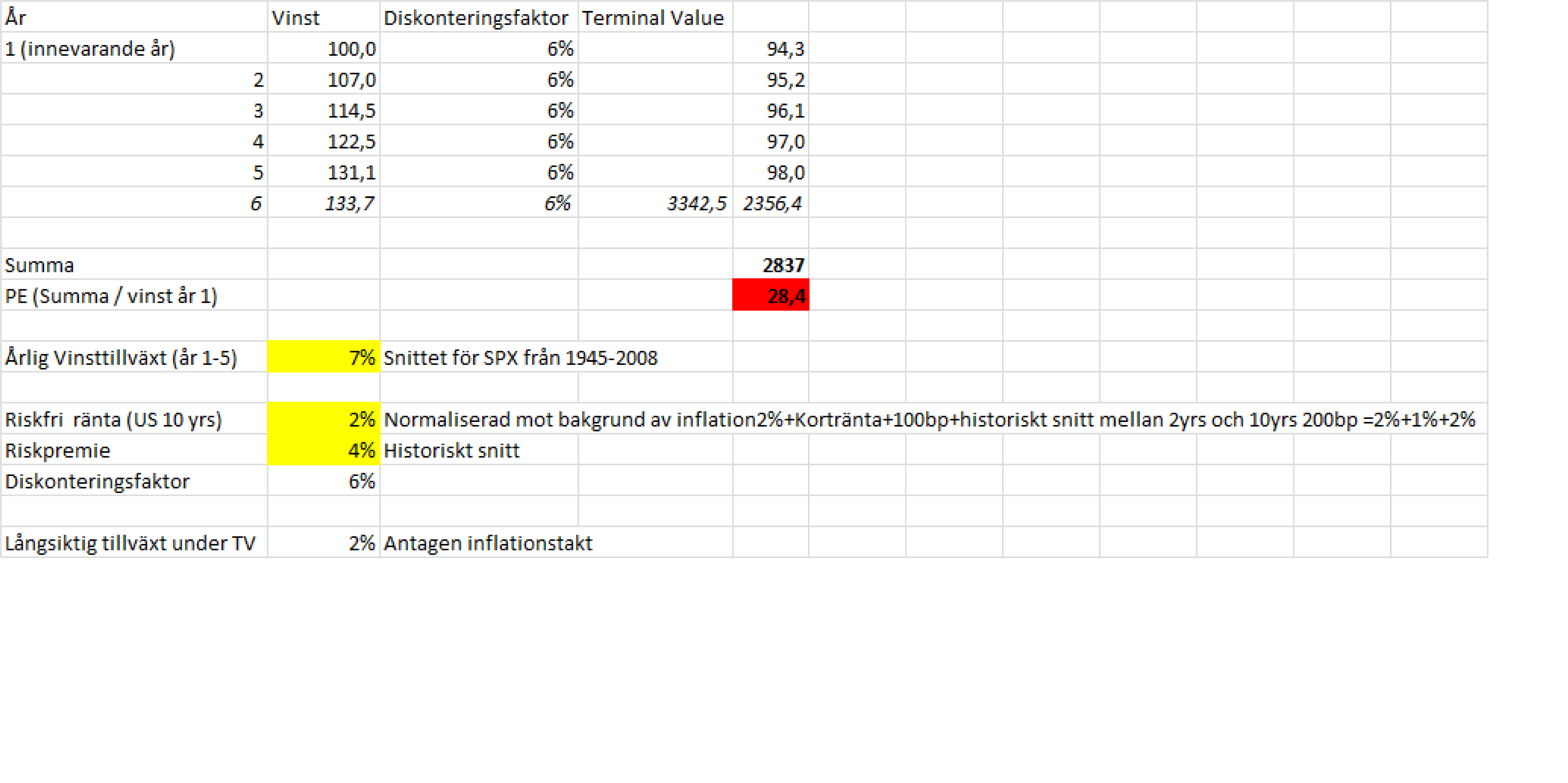 och vips flyger det motiverade PE talet upp till 28,4. Skulle jag sänkt räntan till 0…. ja då stiger PE till 57,9. Bara för att ni ska förstå kraften i ränteförändringarnas inverkan.