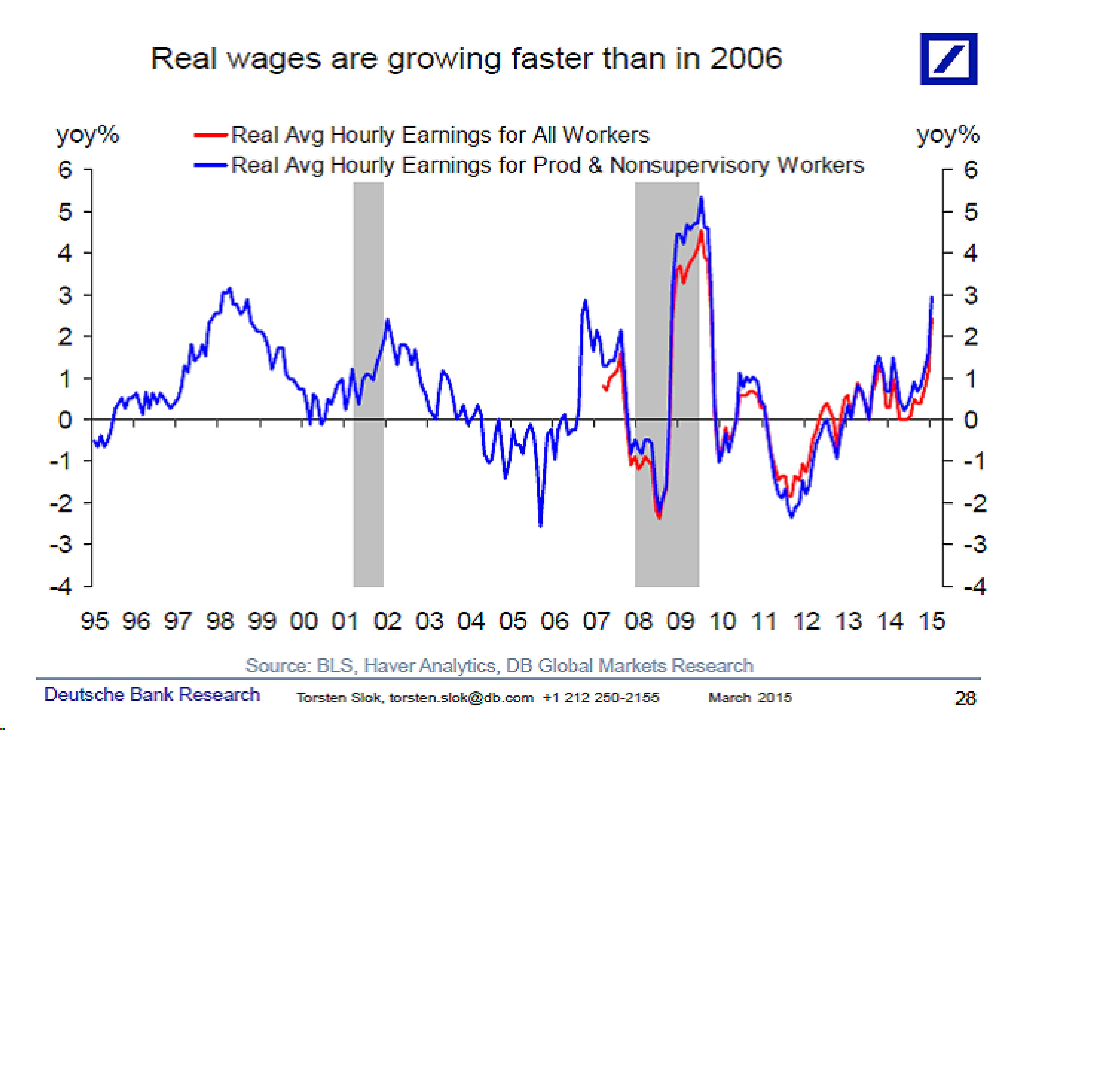 Nedan chart visar reallönerna i USA. säger inte mer än att lönerna stått stilla samtidigt som cpi gått ner i spåren av oljeprisfallet. Detta bådar såklart gott för privatkonsumtioner, men redan under 2H15 borde den mattas av då YoY effekten av oljan klingar bort. Frågan är vad som händer med lönerna? Tror inte att FED fäster så stor vikt vid denna. Tror i så fall löner minus core PCE är viktigare. Men som leading för räntorna är den knappast… den var ju negativ under 04/05.. för att sen tar fart under 06. Det som är intressant är att under 2013 och 2014 när bla jag trodde att löneinflationen skulle ta fart men så gjorde den inte det. Varför, jo för att realt så gick konsumenten plus, trots att lönerna stod stilla. Det skulle även fungera som motiv idag faktiskt. VARFÖR BEHÖVER ARBETSGIVARNA HÖJA LÖNERNA NÄR ÖVRIGA PRISER FALLER? Detta talar för att löneinflationen trots låg arbetslöshet och starkt jobbskapande inte kommer utmynna i högre löner för att realt har man det ok. Detta ska ställas mot hur tajt arbetsmarknaden börjar bli, och där vi går mot en marknad som är arbetstagarens… inte arbetsgivarens. FED ser detta, och gör sig istället databeroende… det är klokt. Marknaden verkar å andra sidan väldigt säker på att höjningarna kommer i juni…. det kan vara ett misstag!