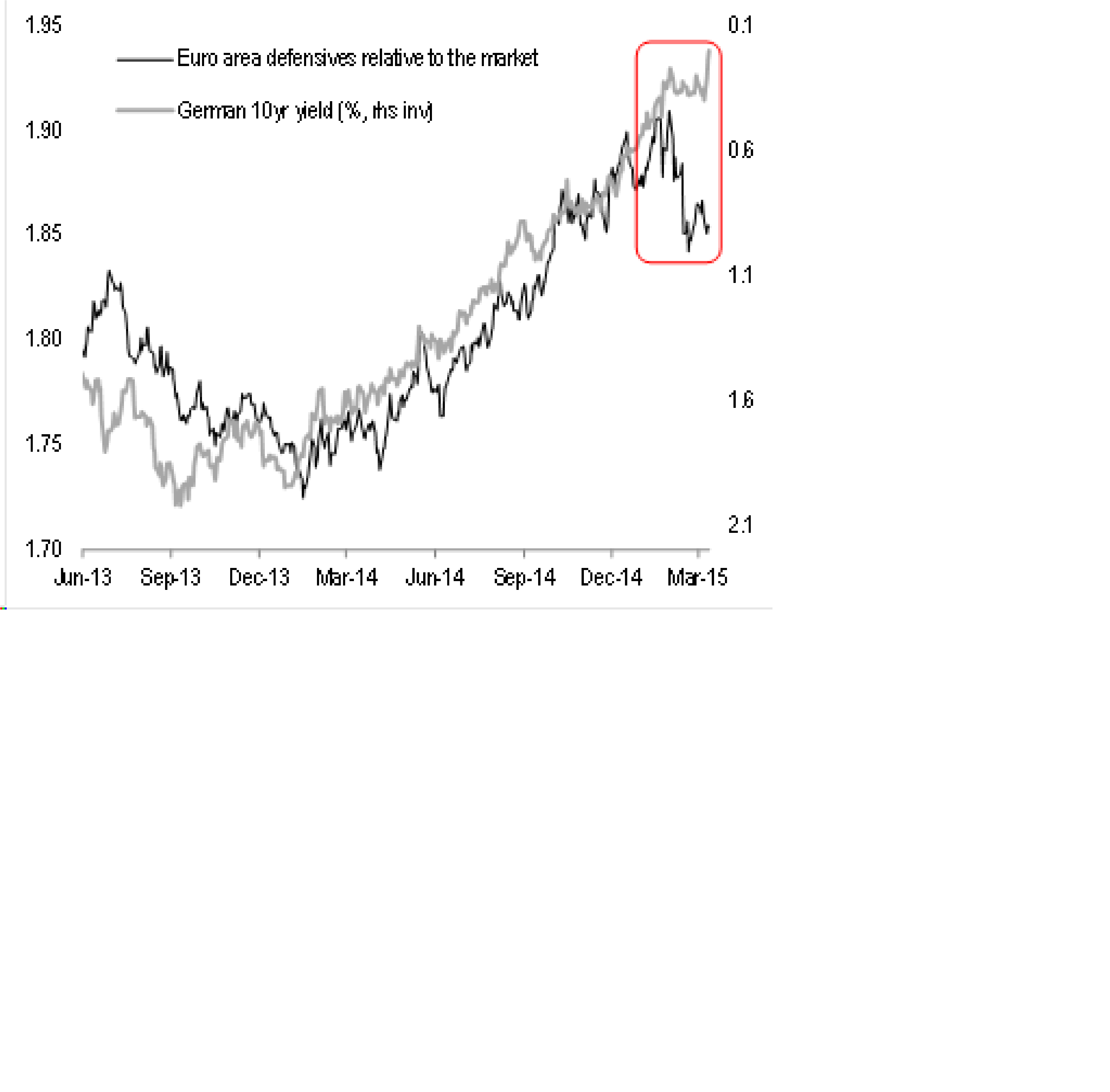 Intressant att se nedan, dvs att Bunden faller men defensives går dåligt. Förklaringen tros vara att man tror att Draghis åtgärder att försvaga euron är bra för konjunktur och tillväxt, och därmed cykliskt. Dessutom hade defensives gått bra innan och var högt värderat. Fair enough. Det jag ifrågasätter är Bundens styrka. Visst, det förklaras av QE. Men om nu den europeiska konjunkturen kickar in + att räntorna fortsätter att stiga på andra sidan av Atlanten… hur långt tror ni att Bunden kan gå. Ta hem vinsten säger jag!