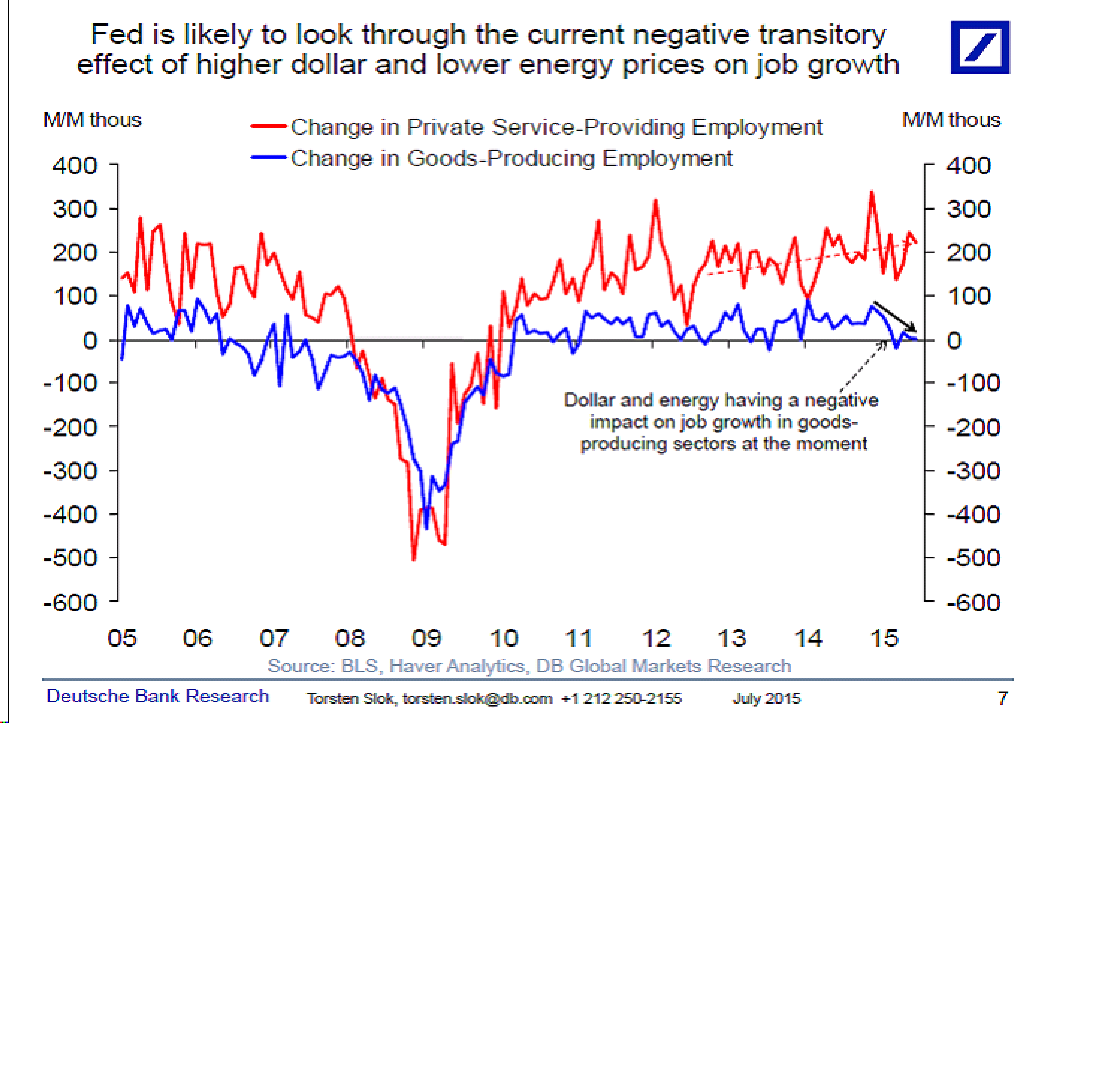 Dollarn styrka under 2014, har gjort det tufft för Goods producing industries, vilket har inneburit att det inte skapats några jobb i denna sektor under 2015. Oljan spelar också viss roll för jobbskapandet i Energisektorn i USA. Med det sagt, hade vi inte haft en dollar försvagning, så hade det troligtvis skapats fler jobb, vilket utmynnat i löneinflation. Eftersom tjänstesektorn är så stor i USA så är det oftast ett bias mot den i undersökningar där man ex frågar, tycker du det är svårt att få jobb, väntar du dig högre lön etc. Dvs alla dem undersökningar som under rätt lång tid pekat på löneökningar.