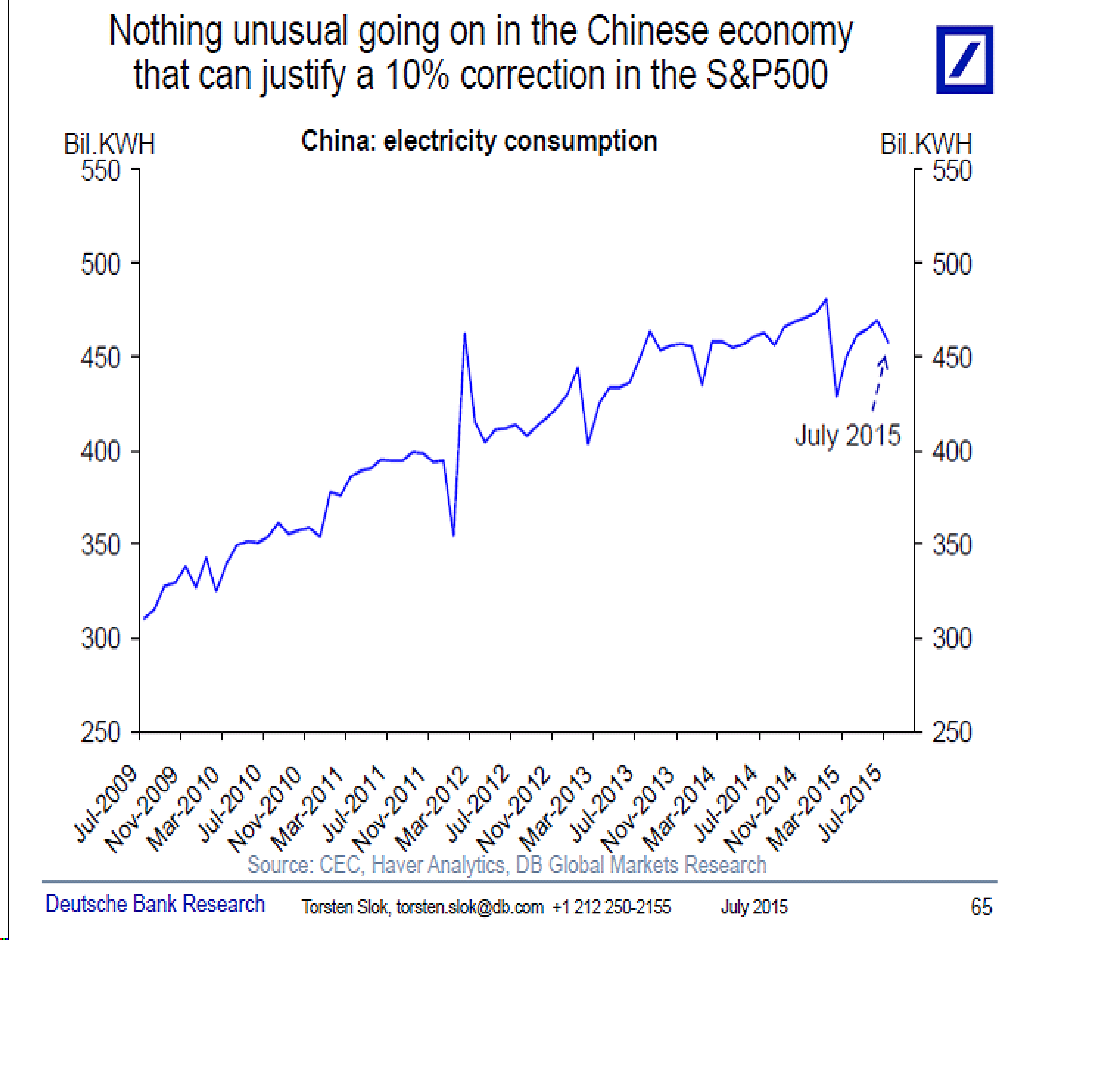 In the mid-1990s I worked at the IMF in the Asia and Pacific Department in the division covering China and we used to spend a lot of time debating the Chinese data, and when I look at the latest numbers for electricity consumption I just don’t see any signs that the Chinese economy is experiencing a hard landing, see chart below. Instead, I think markets are gyrating because of investor worries about valuations, combined with low liquidity in markets for regulatory reasons. The Fed, ECB, BoJ, SNB, and PBOC have printed so much money in recent years and that has pushed asset prices, in particular in the US and Europe, to high levels. Unfortunately, the wealth effects on the real economy of higher stock prices, higher bond prices and higher home prices have been very weak and as a result central banks have continued to keep interest rates low. But low interest rates and QE for seven years have resulted in more and more upward pressure on asset prices and investors are beginning to ask if asset prices have increased so much that they have become disconnected from expected future cash flows of assets. Or put differently, with asset prices going up not because of better fundamentals but because of central banks printing more money investors have over time become more and more uneasy about valuations and in many client discussions over the past year I have heard talk about when we will get a correction. Now the correction is here and “something in China” is a convenient excuse for having a correction in the stock market. Looking ahead, the real test to both stock prices and bond prices is what happens when central banks globally stop printing money and begin to raise interest rates. Given the Fed is the only central bank thinking about raising interest rates we are in my view not near the end of the current asset price inflation regime. We will only get there once the global economy reaches full capacity and that is not anytime soon. Bottom line: Buy risky assets on dips, because global central bank money printing will continue to force investors out the risk spectrum, including into US equities.