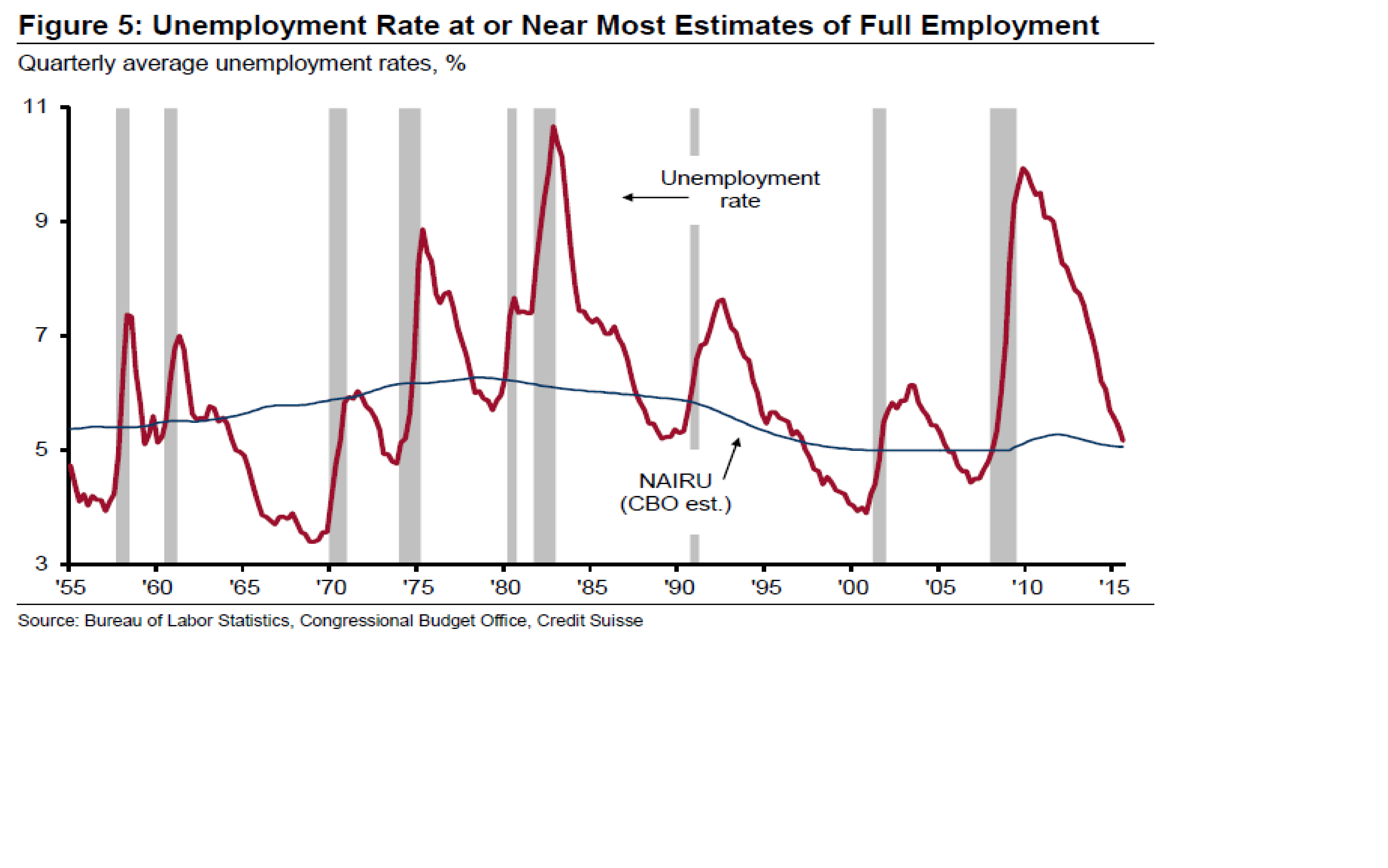 CS försöker bryta ner vad det är som har förklarat skillnaden mellan faktisk inflation och målet om 2%. Som ni ser förklarar oljan en hel del. Men det är Core PCE som är intressant. Men lyfter man bort den anser CS att det faktiskt är dollarn som på YoY basis förklarar mestadels av skillnaden. Men lönerna ligger ju 2,3%, vilket kokar ner till 1,3% core (med antagandet att den historiska spreaden på 1% håller), och det är där vi är. därför vill jag få det till att det är framförallt lönerna som förklarar skillnaden till 2%. Men de menar att det är dollarn. Hursomhelst, YoY effekten på dollarn börjar klinga av i januari och det ska bli intressant hur core PCE börjar bete sig då. Har de rätt så är en höjning i mars väldigt trolig, även utan stora löneökningar. Jag har tror trots allt att lönerna behöver lyfta någon för att vi ska börja tro på högre core PCE. Å andra sidan är risken rätt stor med tanke på NAIRU. Å andra sidan har man reviderat ner NAIRU åtskilliga gånger…