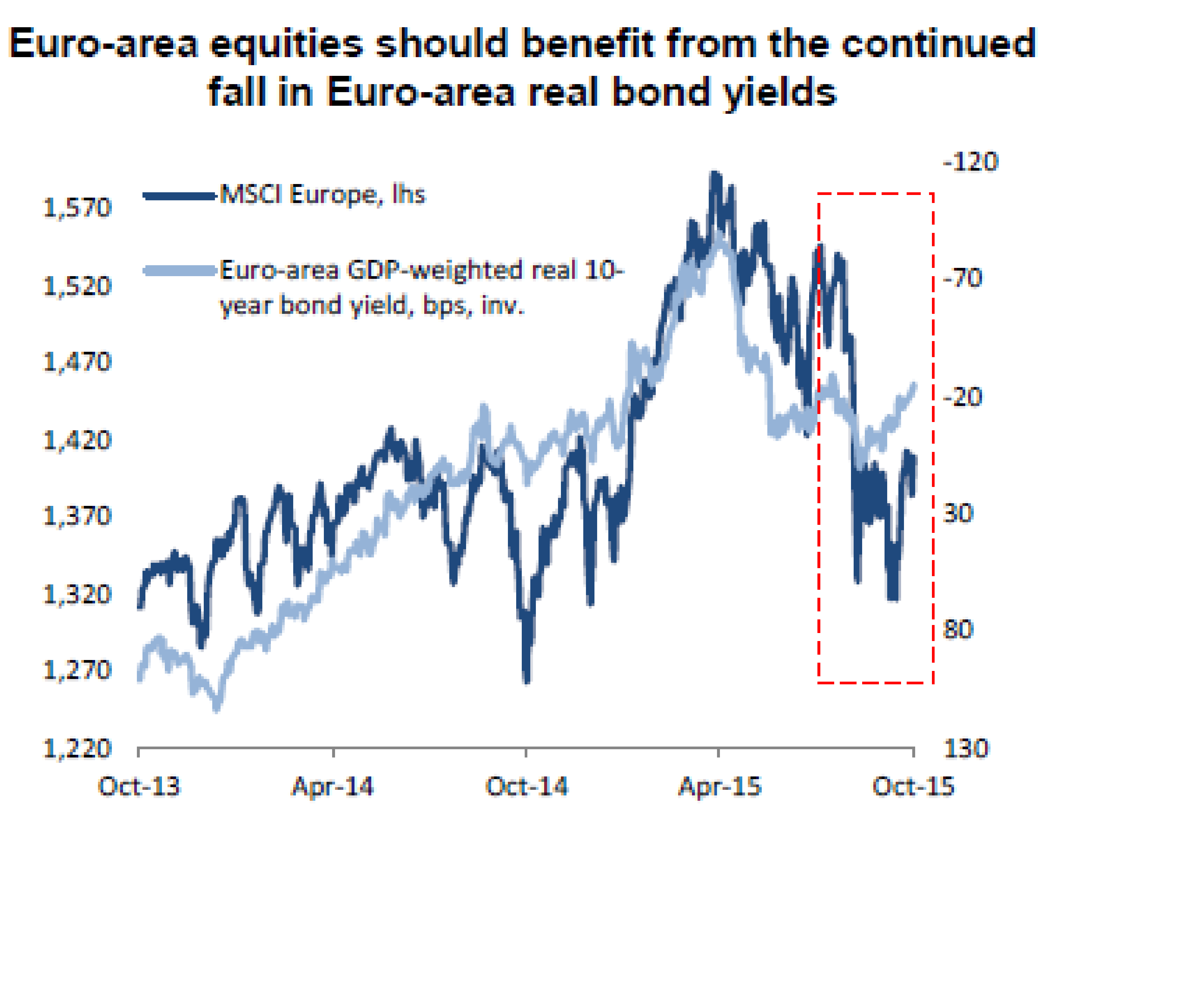 Europeiska aktier har varit väldigt känsliga för förändringen i realräntan. Hela korrektionen på dryga 20% för MSCI Europa från april-sep kan nästan förklaras med att realräntorna gick från -0,9% till +0,1%. Dvs en försändring på 1% gav 20% korrektion. Det är inte orimligt om man tittar längre bak. Då gav en förändring på andra hållet den typen av uppgångar.