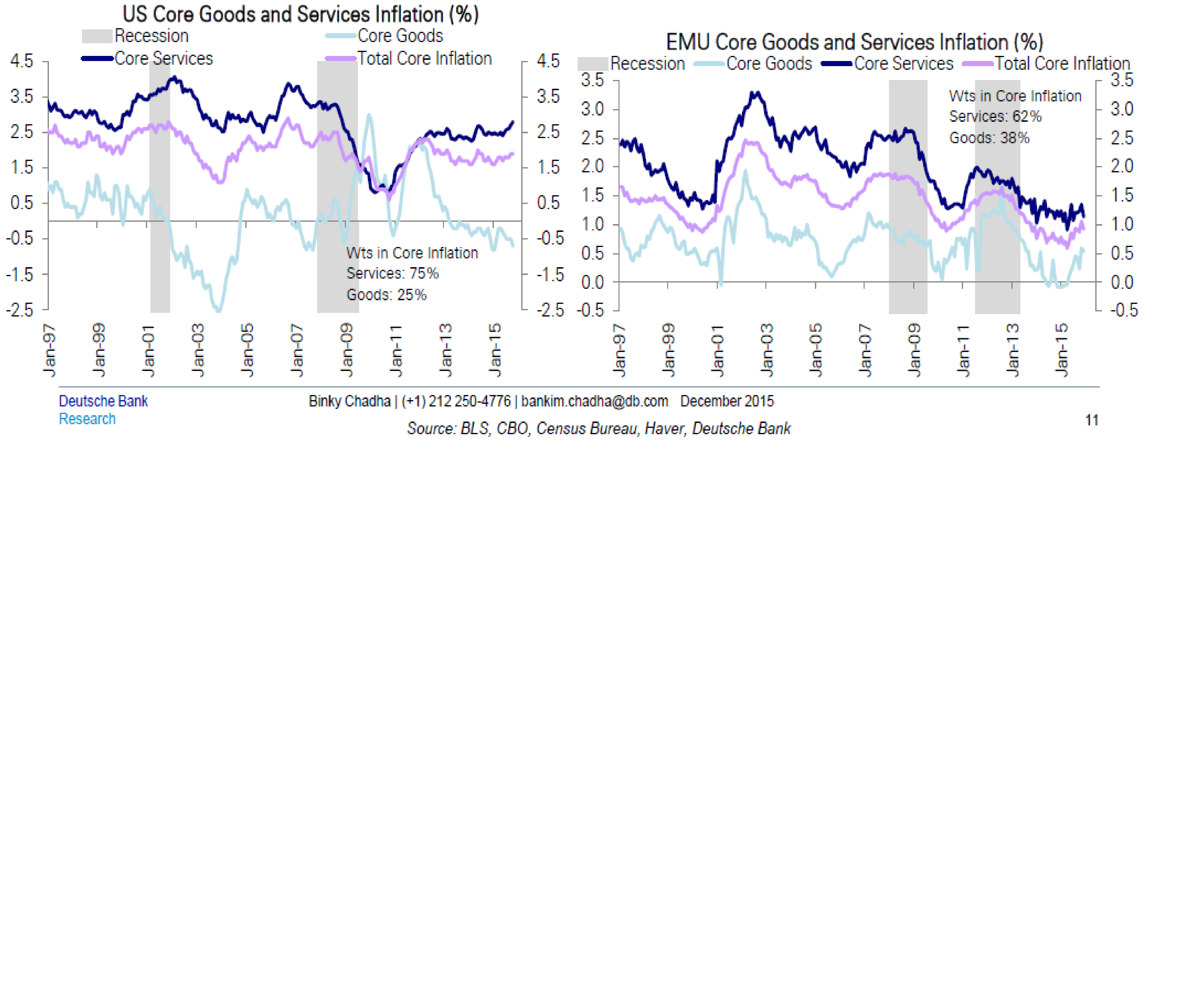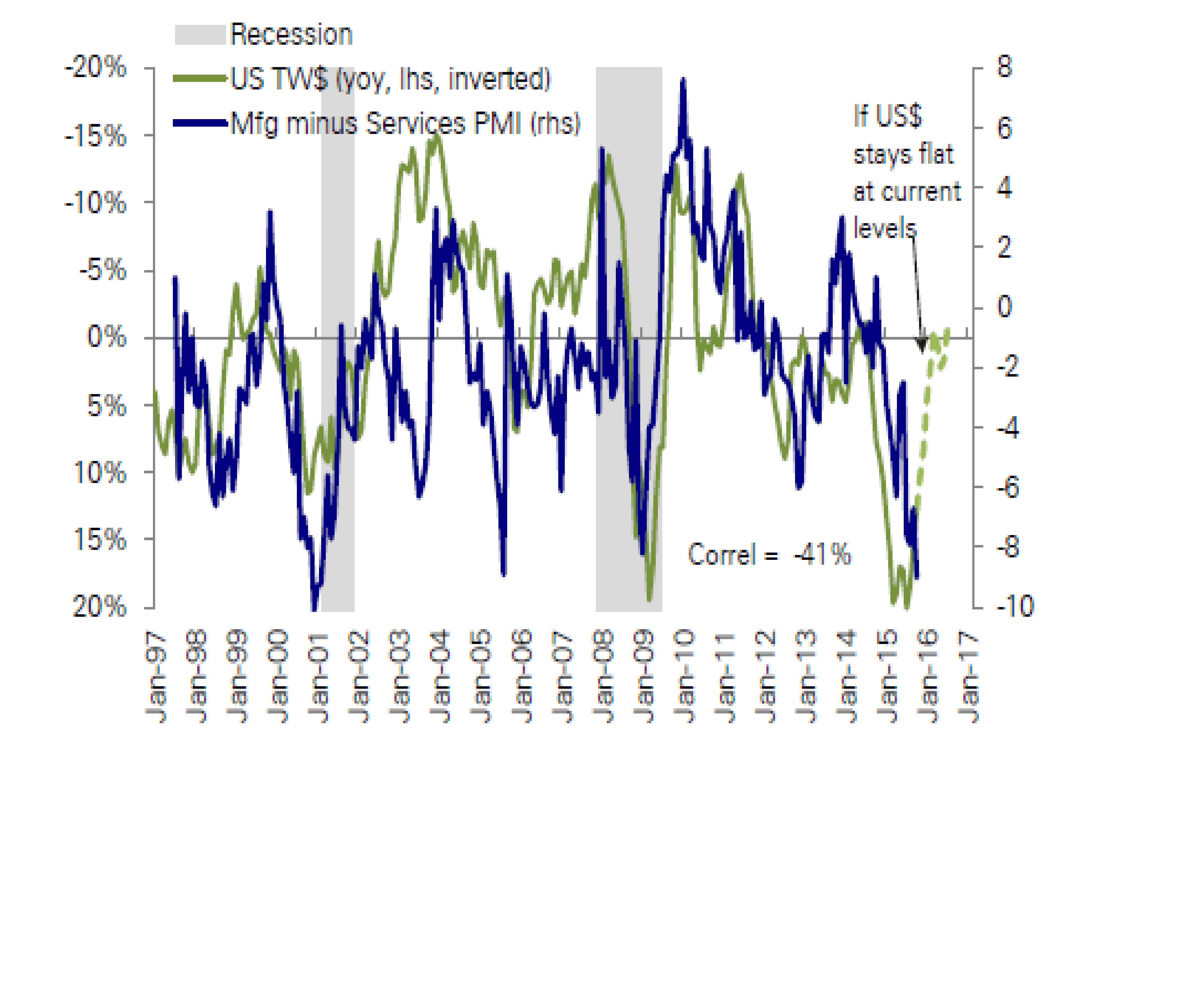 Många är bekymrade varför inte Draghi gasar mer, och många är ivriga att Yellen ska komma igång med höjningar. Det är ganska emotsägelefullt om man ser till nedan vänstra chart. Visst, höger chartet visar att mycket handlar om den starka dollarn som gjort det tufft för den amerikanska industrin, som dessutom till stor del består av energi sektorn, och klingar dollar effekten av under nästa år så borde ISM vända upp….. men som sagt, detta borde ändå till viss del bekymra Yellen!