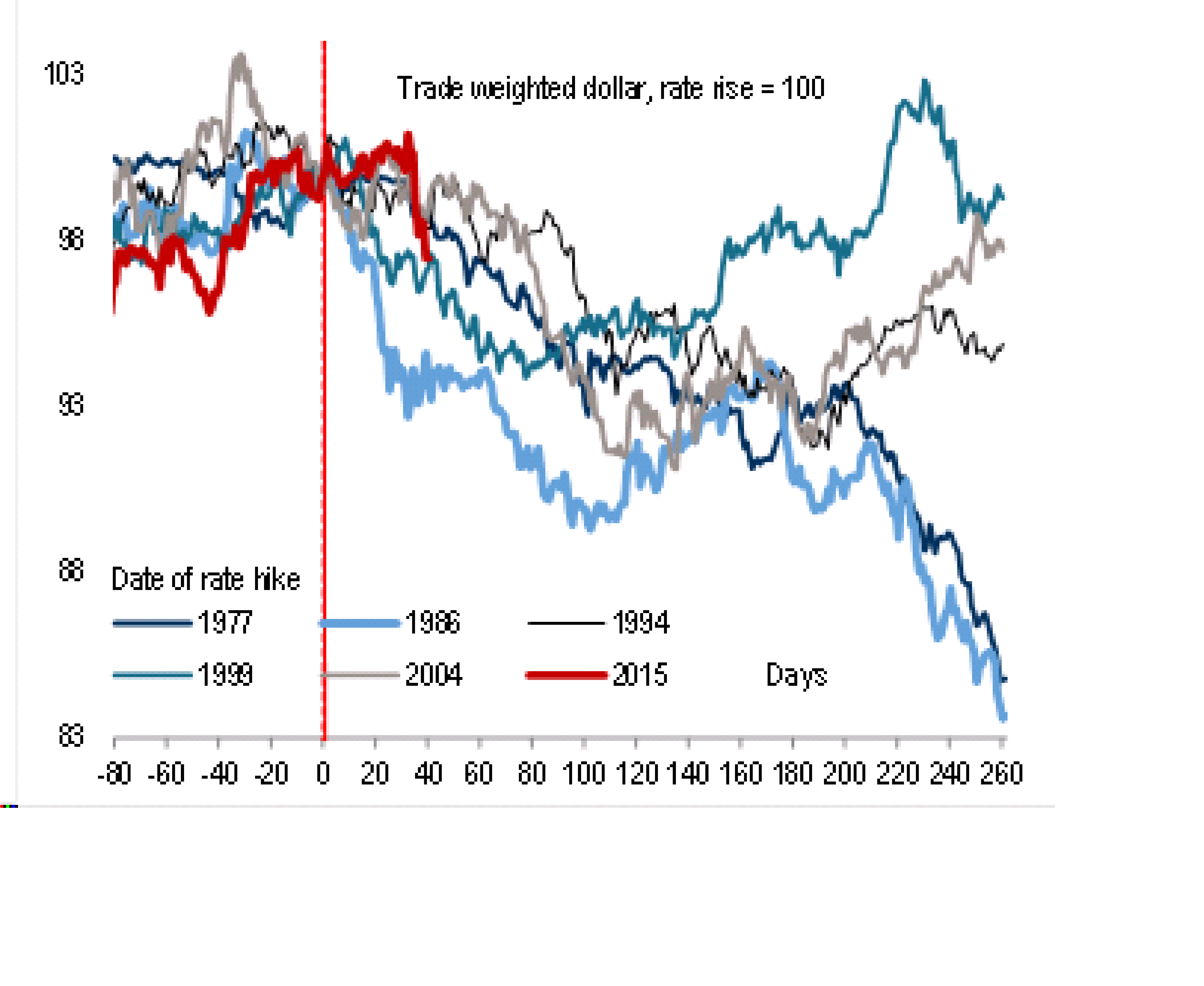 Än så länge har det stämt med det historiska mönstret. Vad? Jo att dollarn stärks FRAM till första räntehöjningen och därefter avtar styrkan, och den börjar försvagas. Men jag vet inte om man ska fästa för stor vikt vid detta. Hade tillväxten varit ok i världen, och överproduktionen så massiv, så hade inte oljan handlats i 30 utan 60usd, och då hade det inte varit lika skakigt i världen, och då hade det varit fokus på räntehöjningar och löneinflation, och då hade dollarn varit närmaste 1 mot euron. Men men…..