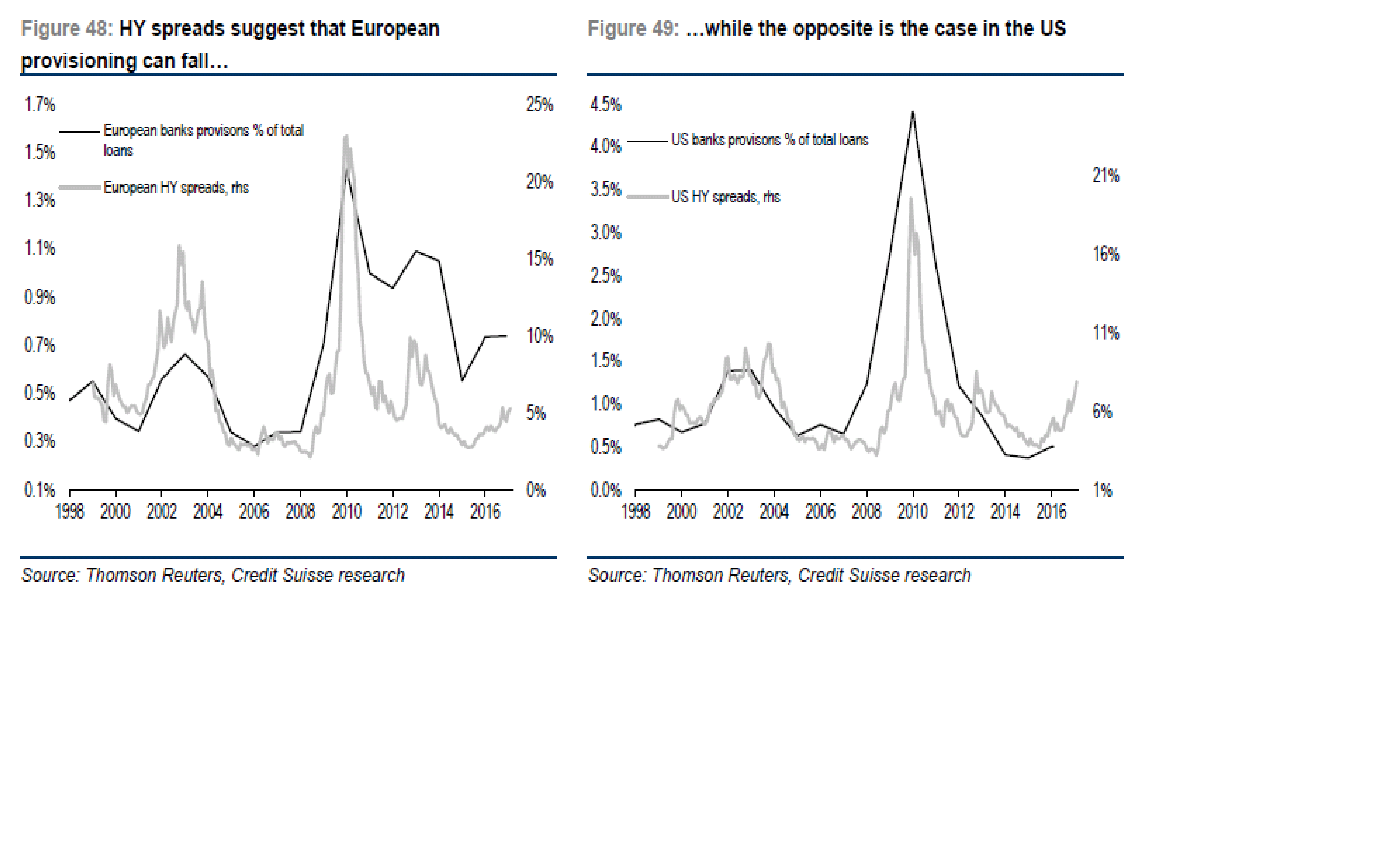 Framförallt har man dragit ner vinstestimaten genom att man dragit upp posten ”provisioning”. Dvs avsättningar för kreditförluster. Men tittar man ur ett historiskt perspektiv så finns det faktiskt en chans att provisions i Europa kommer ner, fast i USA kan de komma att stiga från en låg nivå. Detta förutsätter att Amerikanska energi HY bonds defaultar, och att Europeiska konjunkturen inte blir alltför dålig.