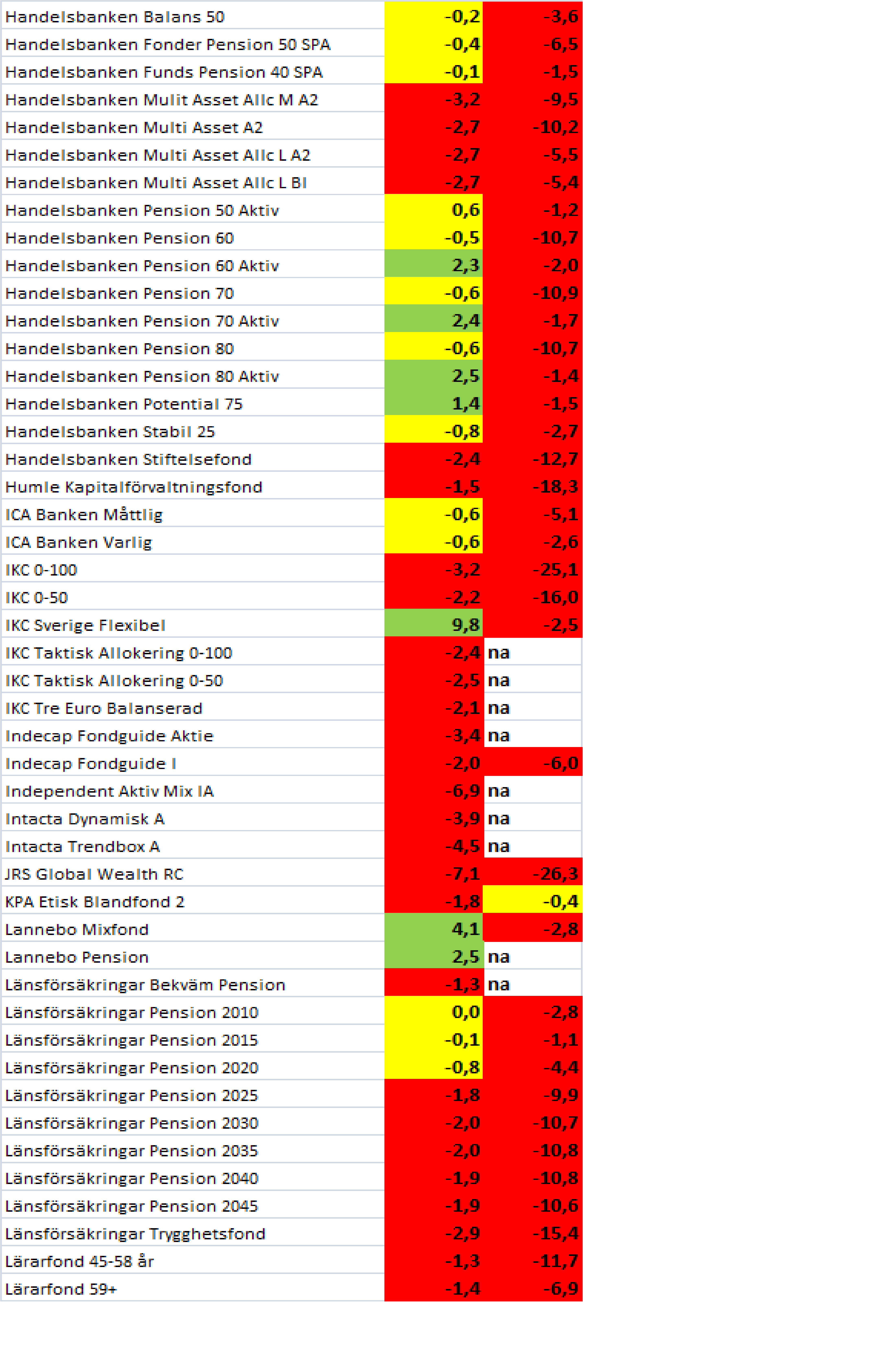 De som är markerade med grönt är Bra, dvs de har varit bättre än att sitta på en kombination av AP7 fonderna som exakt motsvarar fonden. Gult är OK, dvs det har inte varit någon större skillnad, och RÖTT är klart sämre.
