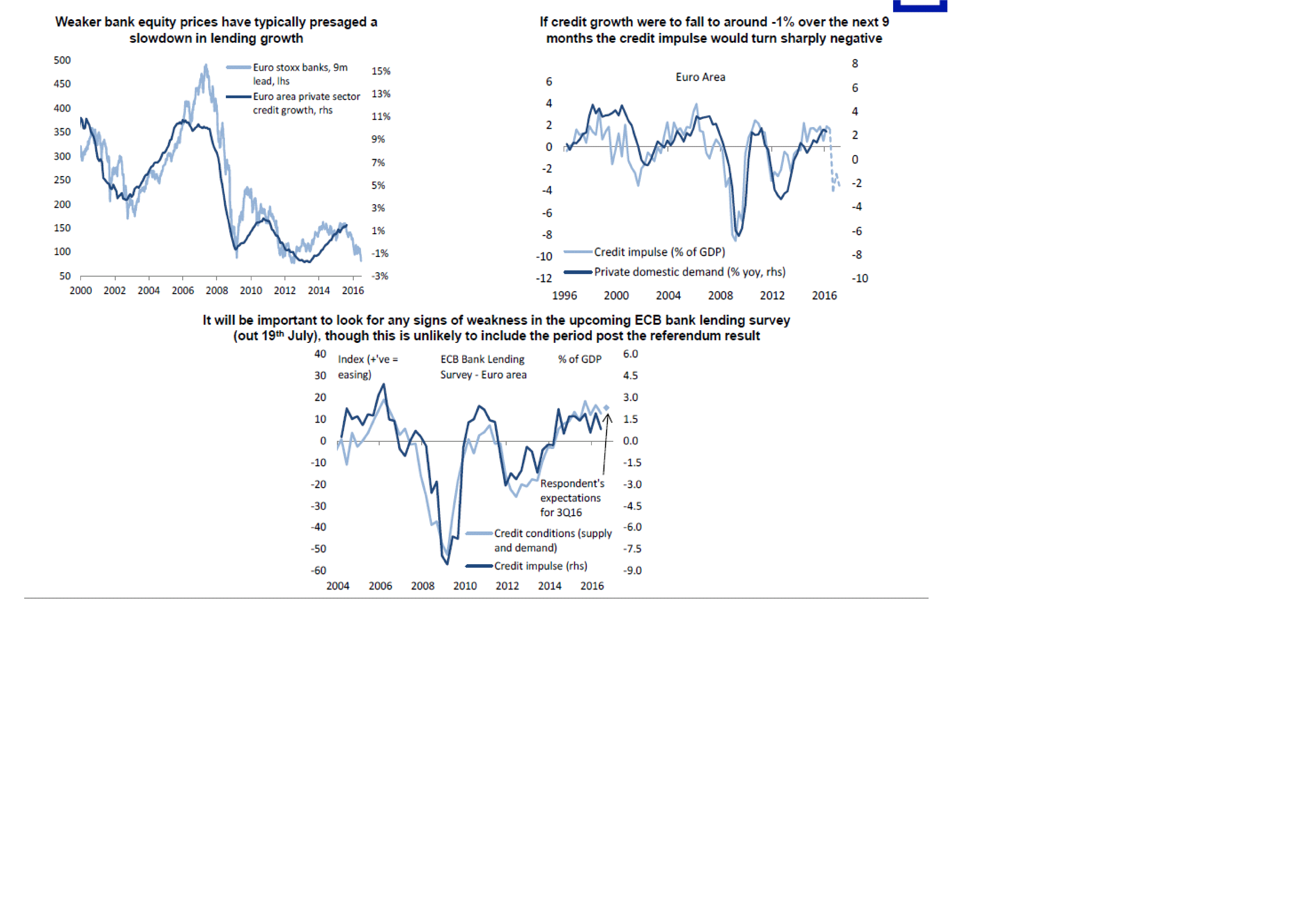 Nedan chart är intressant. Den har visat att när europeiska bankaktier går dåligt så leder dem kreditgivningen till hushållen med 9 månader. Håller detta samband väntar en inbromsning i kreditgivningen framöver. Kreditgivningen i sin tur är skarpt korrelerad med Private Domestic Demand. Det är ju rätt logiskt. Så risken finns att vi får en rätt kraftig inbromsning i europa närmaste 9 månaderna. istället för att vänta på den, så kan man titta på ECB Bank ledning survey. Den kommer den 19 juli, men den fångar inte riktigt post Brexit, så vi får hålla oss till Augusti…