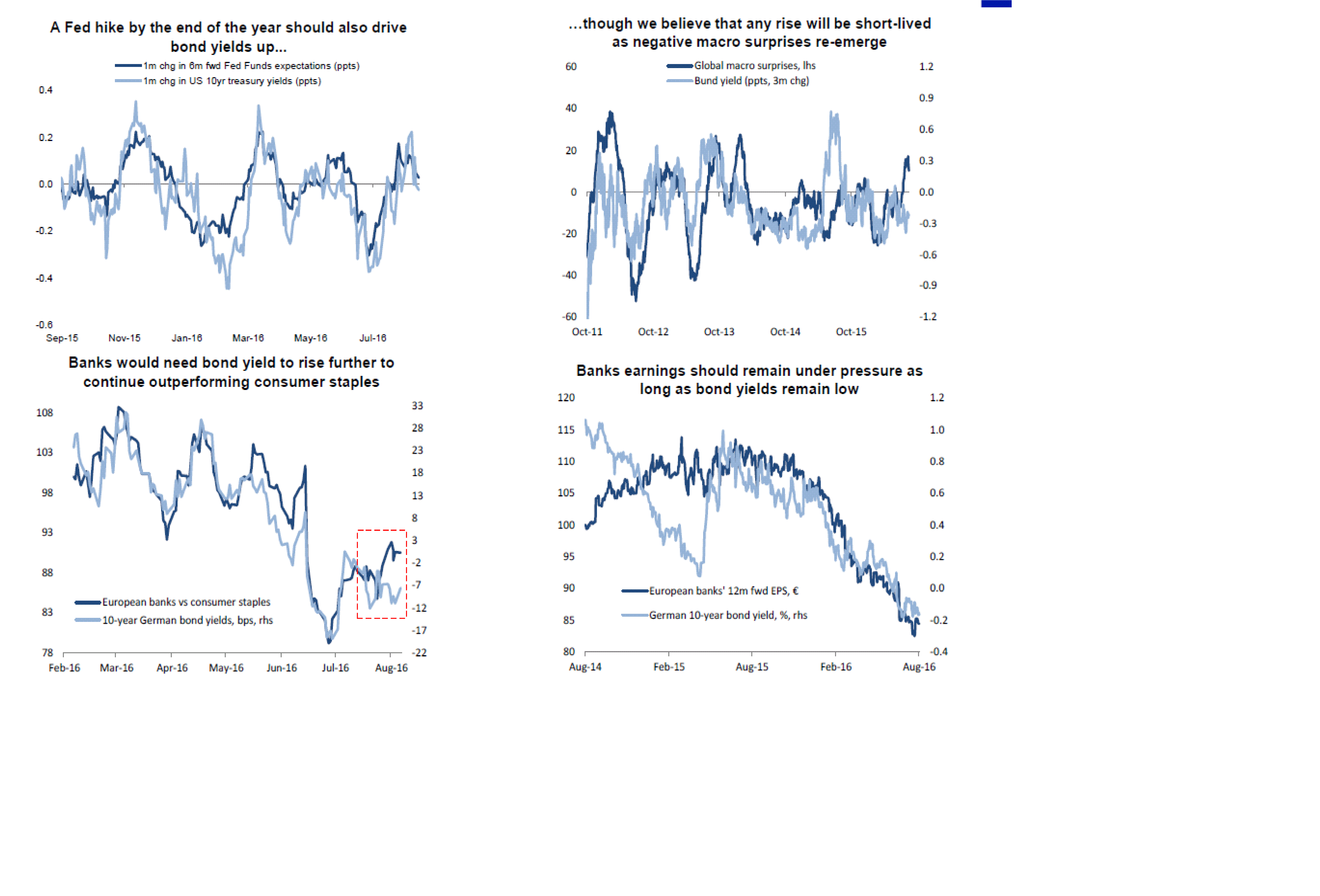 Dagens räntor prisar INTE in någon höjning i vare sig sep el dec. Men CS tror att höjningen kanske inte blir av då risken för sämre makro än förväntad är på väg…. stiger inte bondyields, så lär inte bank gå bra, då nedre högra visar hur Euro Bank EPS är tajt korrelerad med Bunden. Som sagt, risk att datan inte lever upp till förväntningarn, och då kan det blir risigt värre.