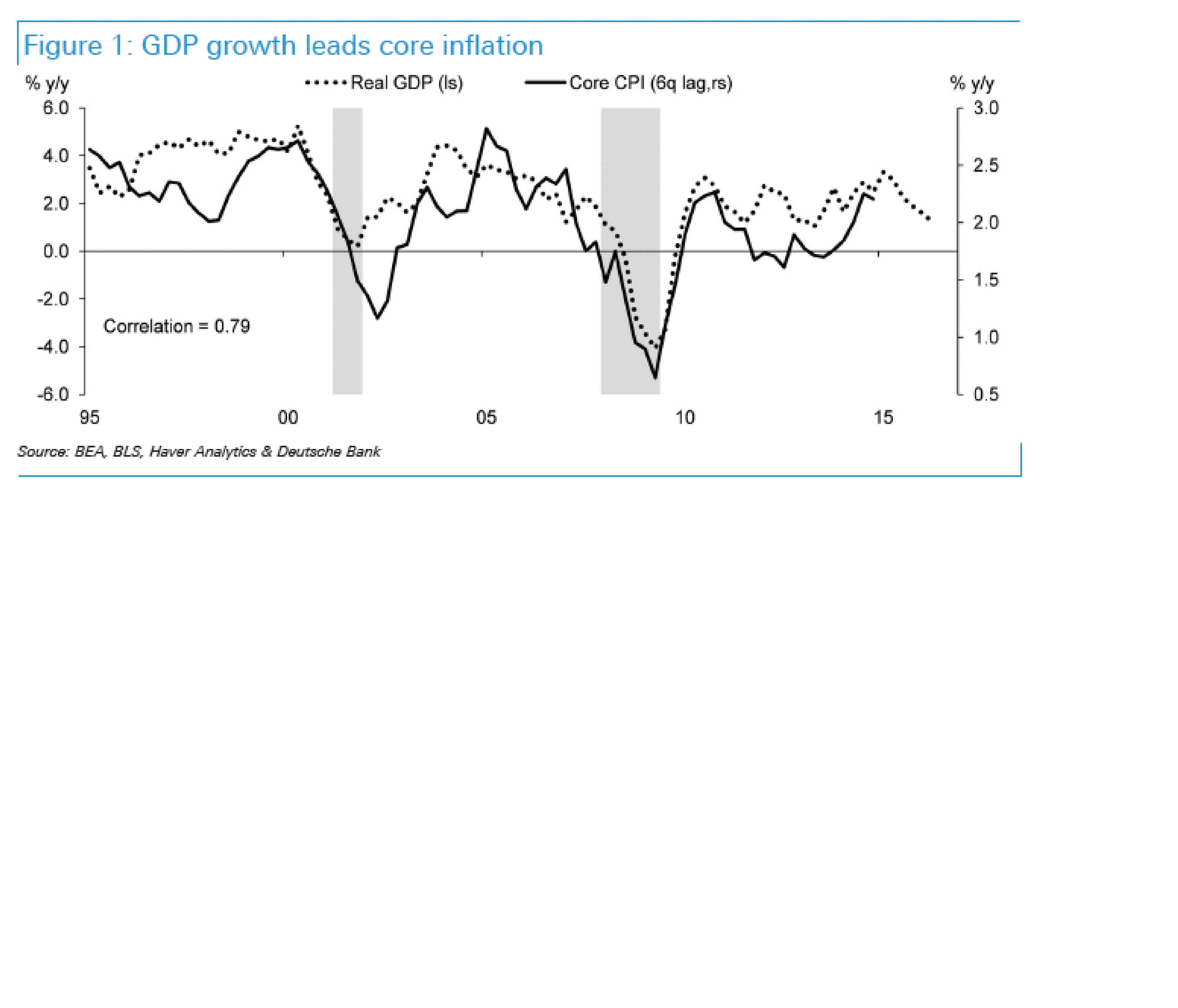 Faktum är att BNP leder Core CPI med 6 månader. Skillnaden mellan core CPI och PCE är att i CPI väger Hyror tyngst, medan hälsovård väger tyngst i PCE. Men ser man till grafen nedan så bör core CPI sjunka ner mot 2% de närmaste månaderna, vilket skulle betyda att core PCE kan komma ner mot 1,3-1,5.