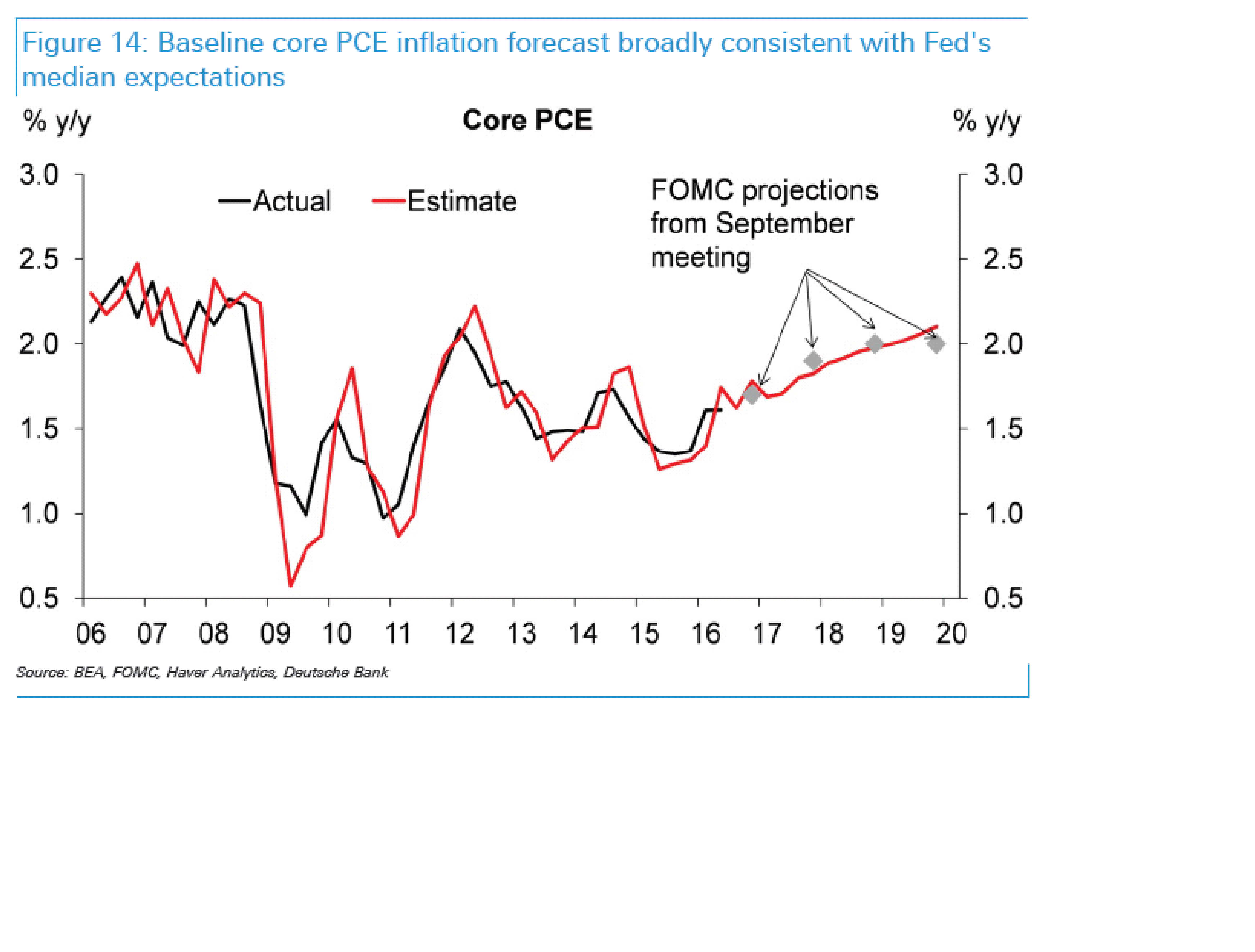 Men givet datan idag, så pekar Deutches modeller, och FEDs för den delen, på att Core PCE inte kommer att nå 2% förrän slutet på 2018. Ur det perspektivet är det lätt att förstå varför FED vill gå från expansiv PP till balanserad närmaste 1,5 åren, dvs från 0,25% styrränta till 1,75 med en 25 punkters höjning varje kvartal från december 16 till mars 18.