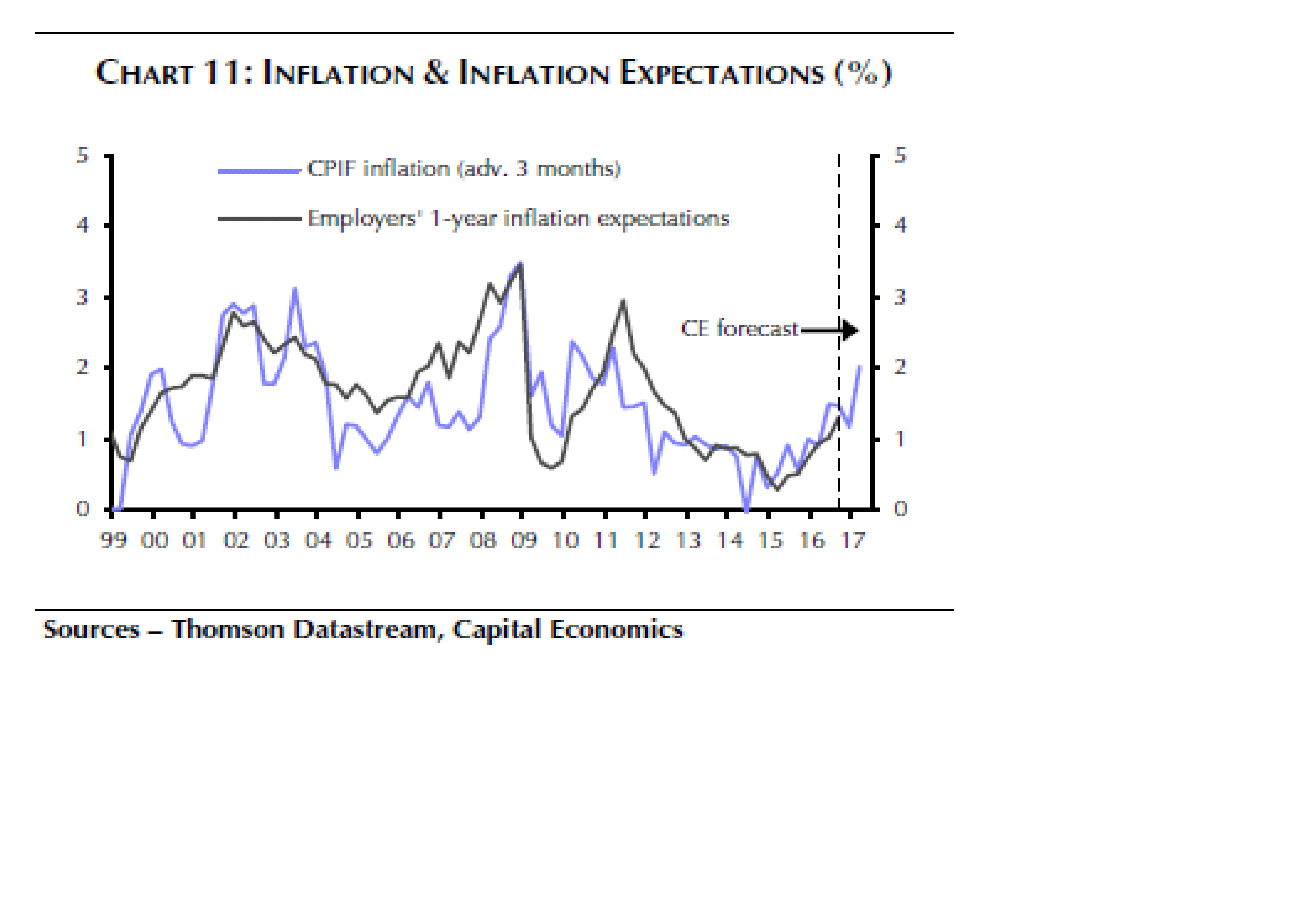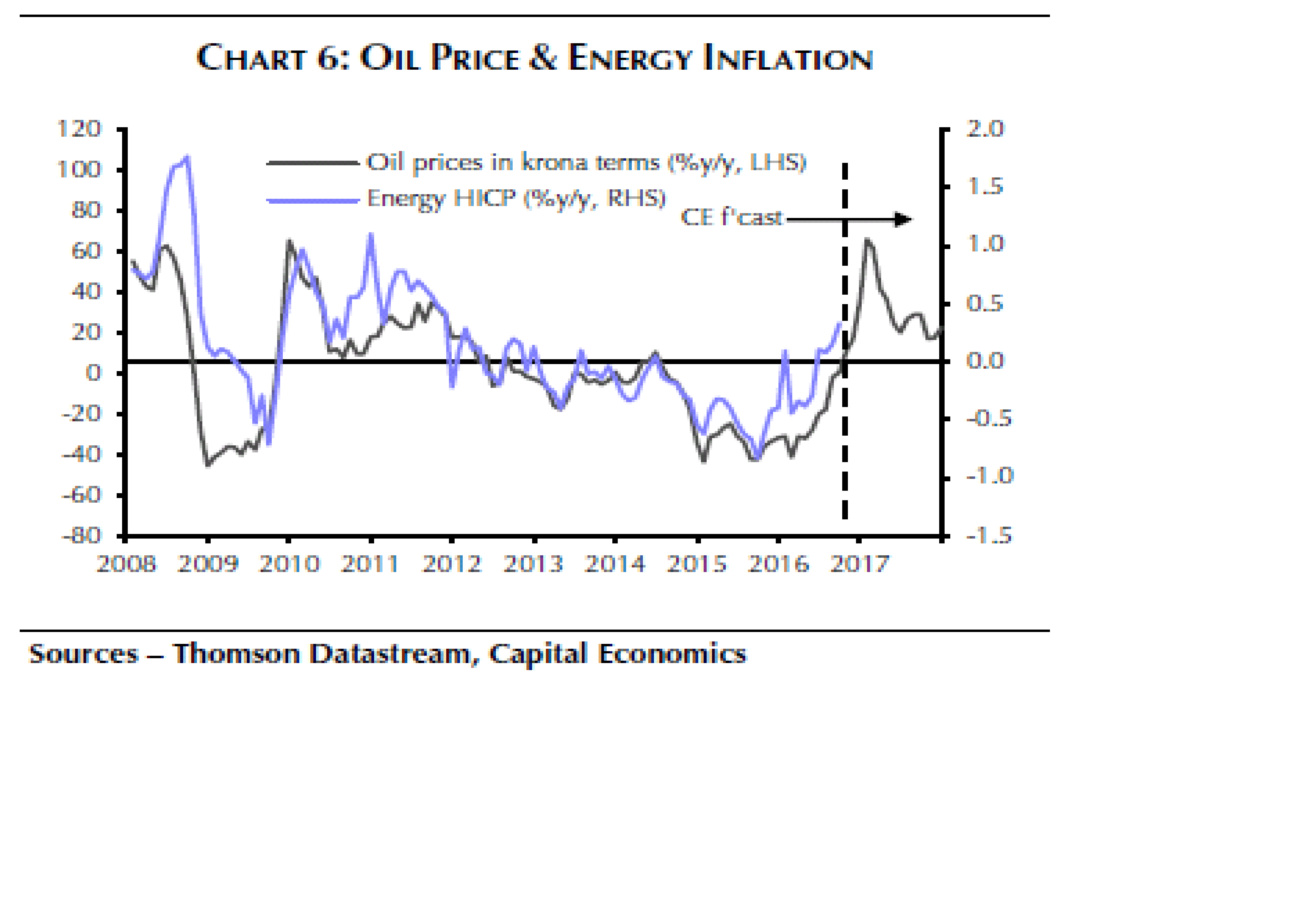 Oljan föll tidigare som en sten, och gjorde att vi importerade deflation via energipriserna. Nu har den vänt och tittar vi in i 2017 så kommer den göra att vi importerar inflation den vägen…