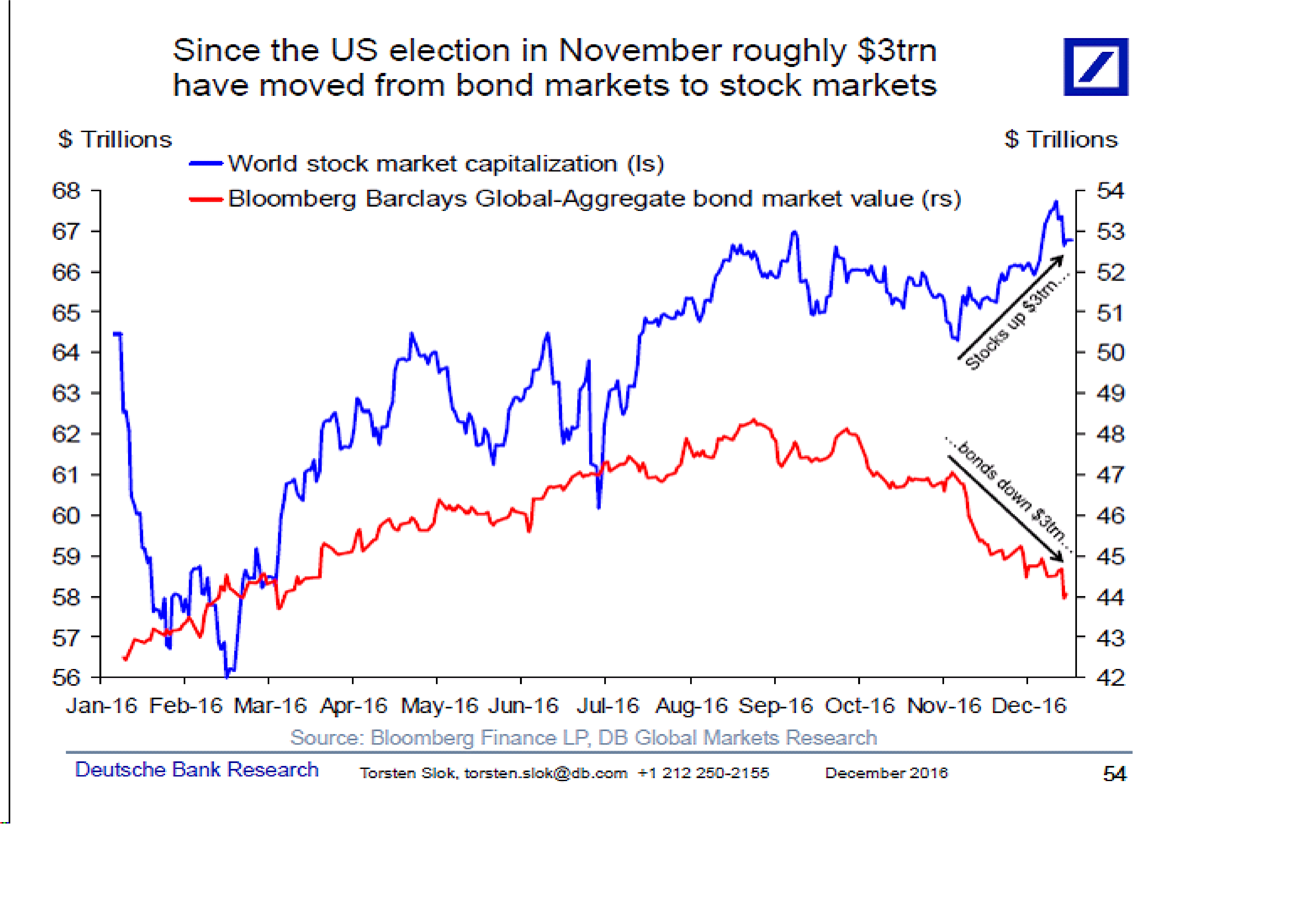 Deutsche talar om rotation ur obligationer in i aktier…. det är många som gör det nu för tiden. Media skriver gärna ”marknaden dumpar obligationer, hamstrar aktier” ”flödena till aktier är starka, matchas av utflöden ur obligationer och räntebärande”