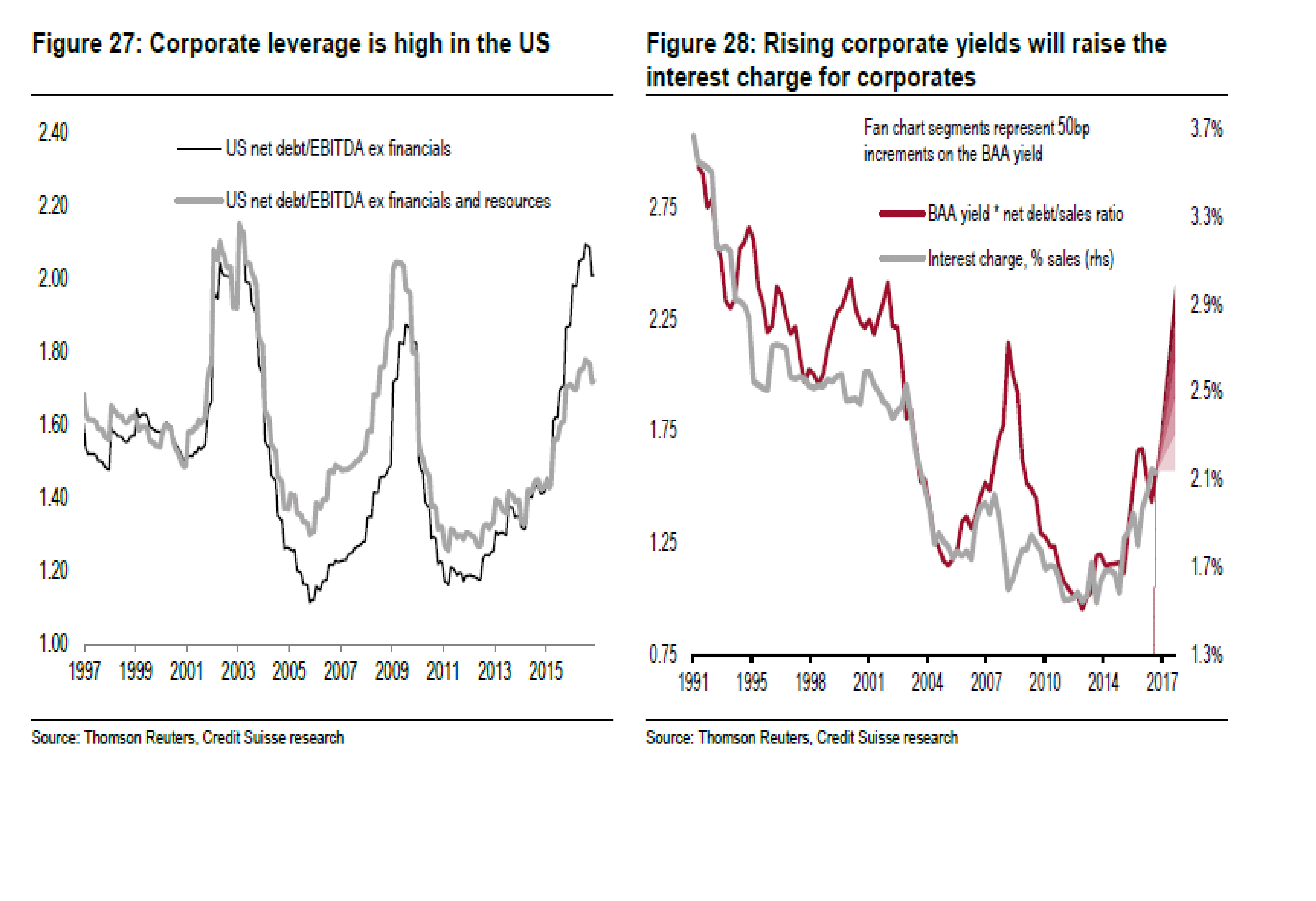 Många tror fortfarande att skuldsättningen i amerikanska bolag är låg, och visst det var den från 2010-2015… men den har tagit fart senaste åren. Aktieägare som vill se utdelningar och aktieåterköp har inte haft något emot att bolagen skuldsätter sig. Räntan är ju ändå så låg…. men vad händer om räntan stiger. Vad händer med vinsterna då?