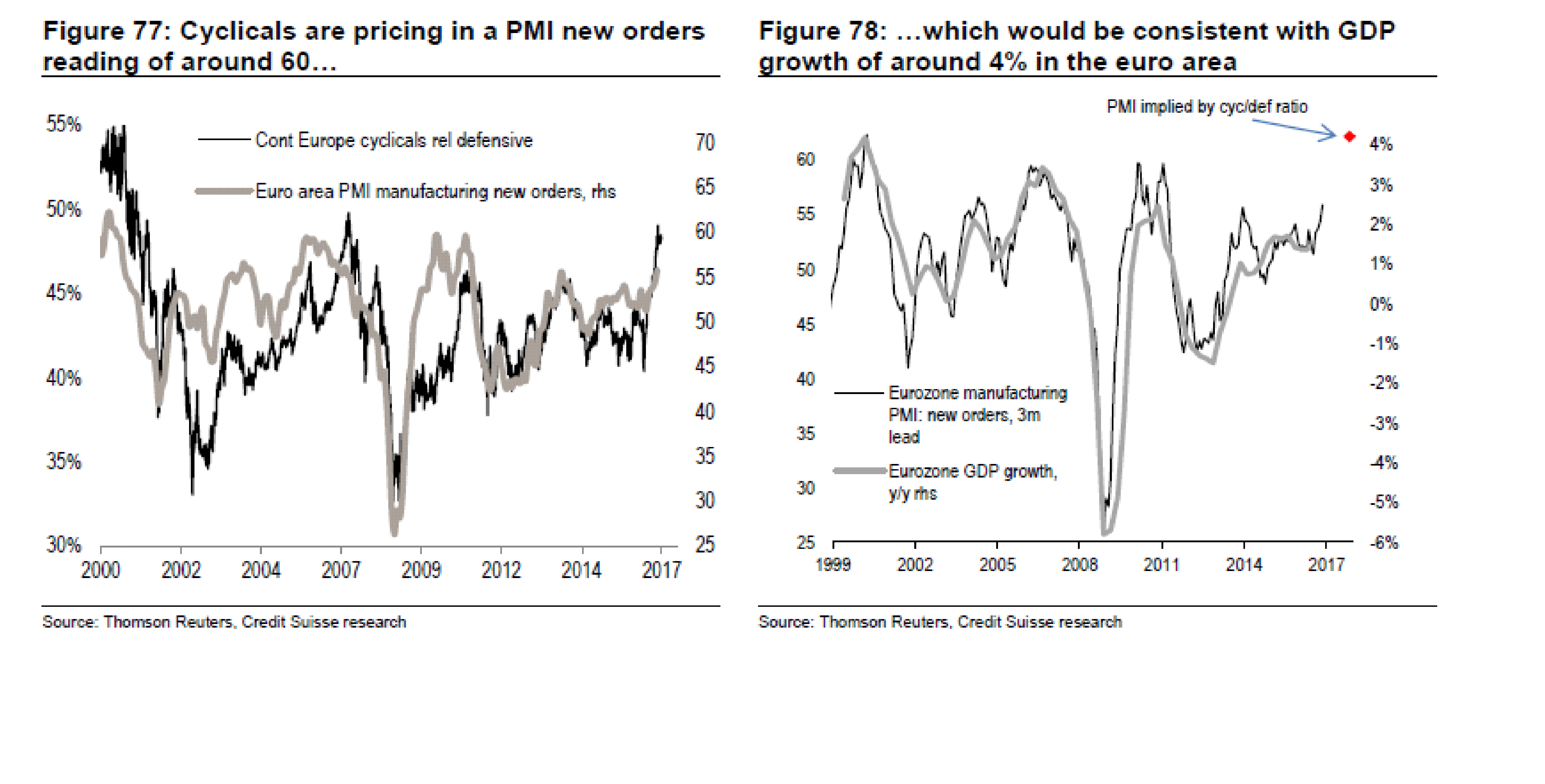 Tittar man på hur Europeiska cykliska bolag gått, så indikerar dem PMI 60, vilket i sig pekar på BNP tillväxt om 4%……. mycket är taget alltså. Var försiktig!