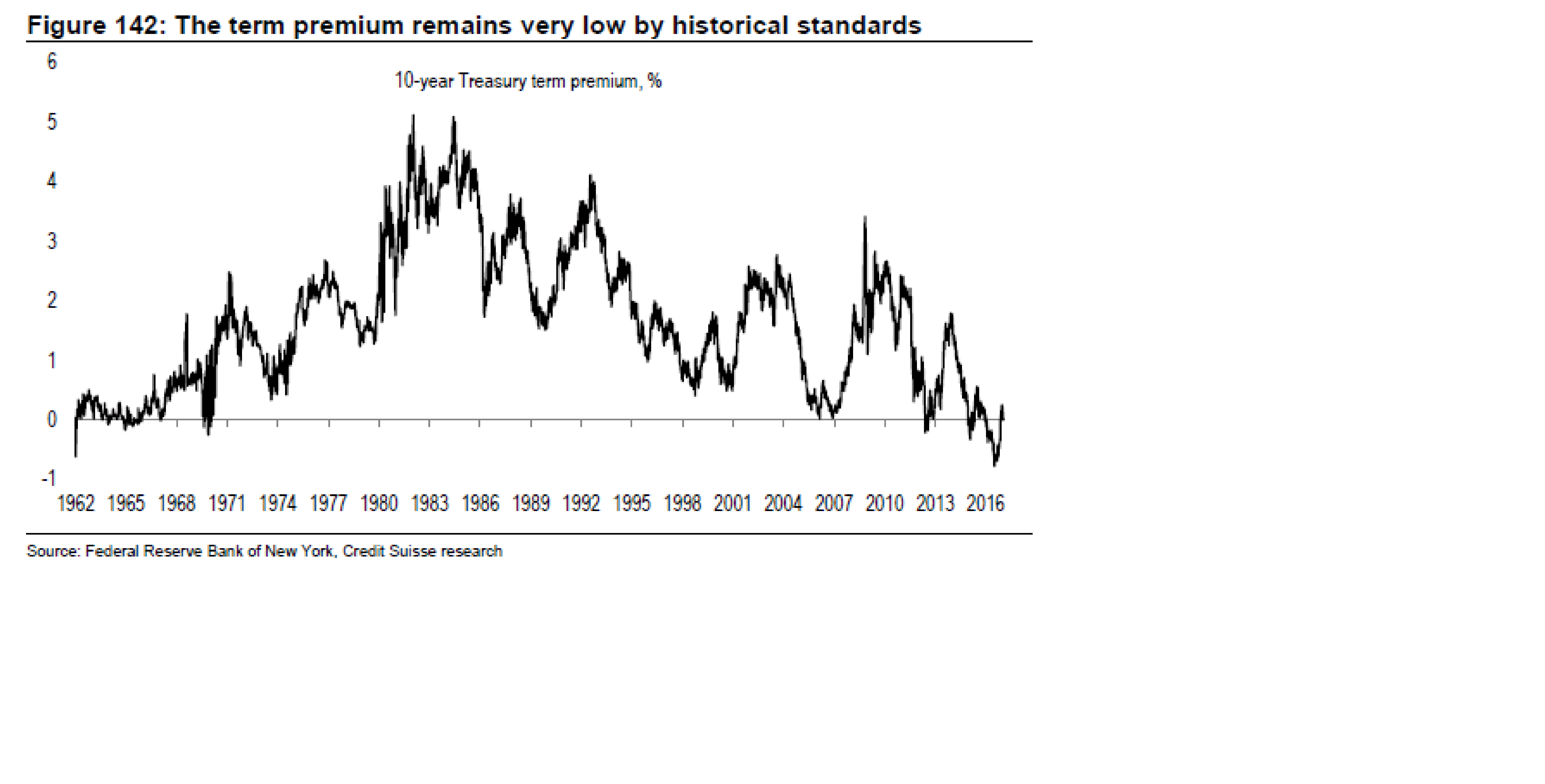 Drar lönerna så drar inflationen. Drar den så höjer FED räntan. Kanske mer än väntat. Term Premium, dvs skillnaden mellan kort och lång räntor är historiskt låg. Det kan innebära att 10-åringen kanske inte bara ska leta sig upp till 3% utan risken finns på uppsidan. Hur bra är det för aktiemultiplar tror ni?