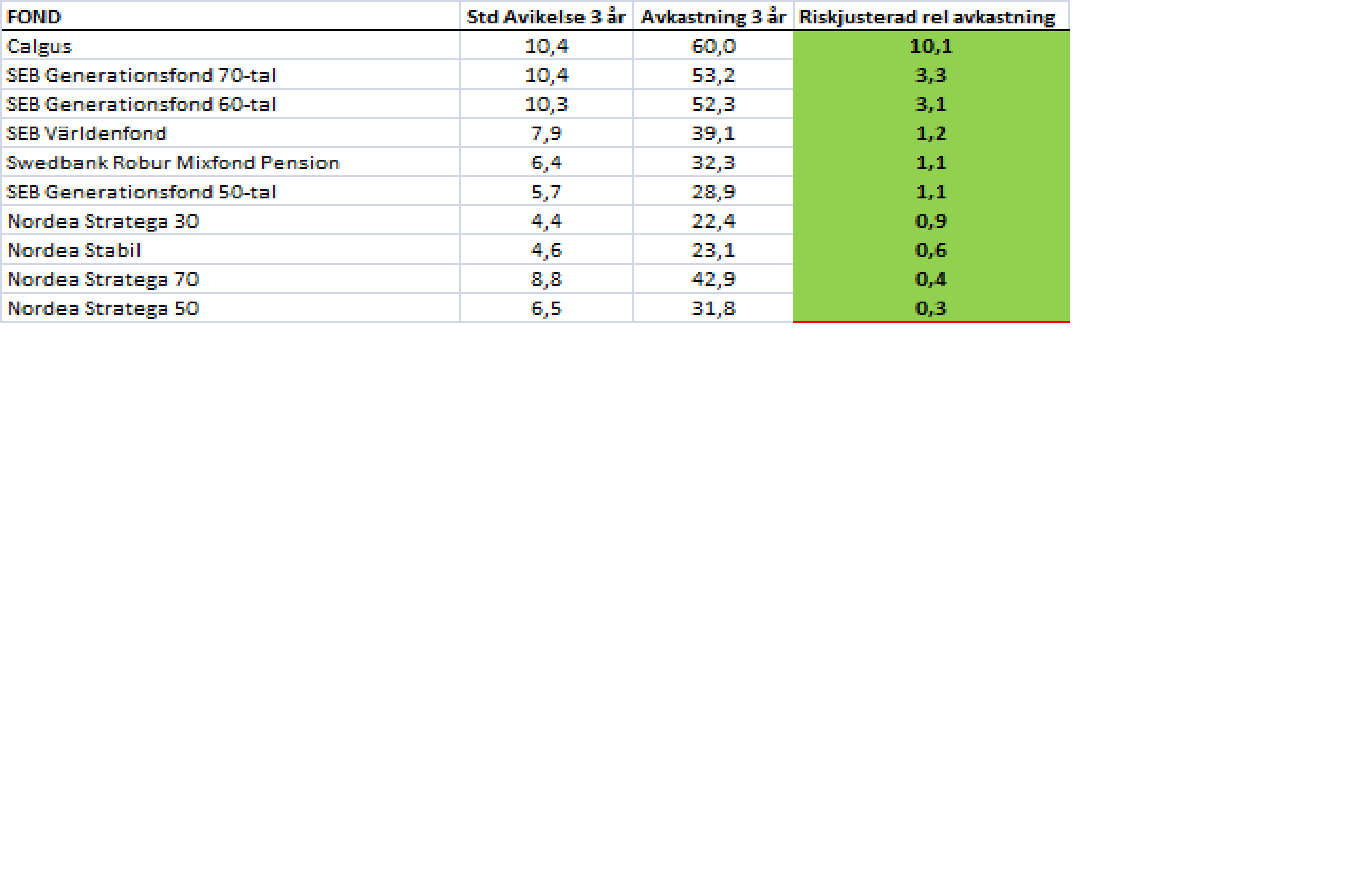 Calgus är förmodligen Sveriges bästa Blandfond just nu. Anledningen till att den inte ÖVERavkastade senaste året beror inte på svag utveckling, den har faktiskt gått upp med ca 35%. En procent bättre än Ap7 Aktie. Nej det handlar om att den har gjort det till väsentligt högre risk.