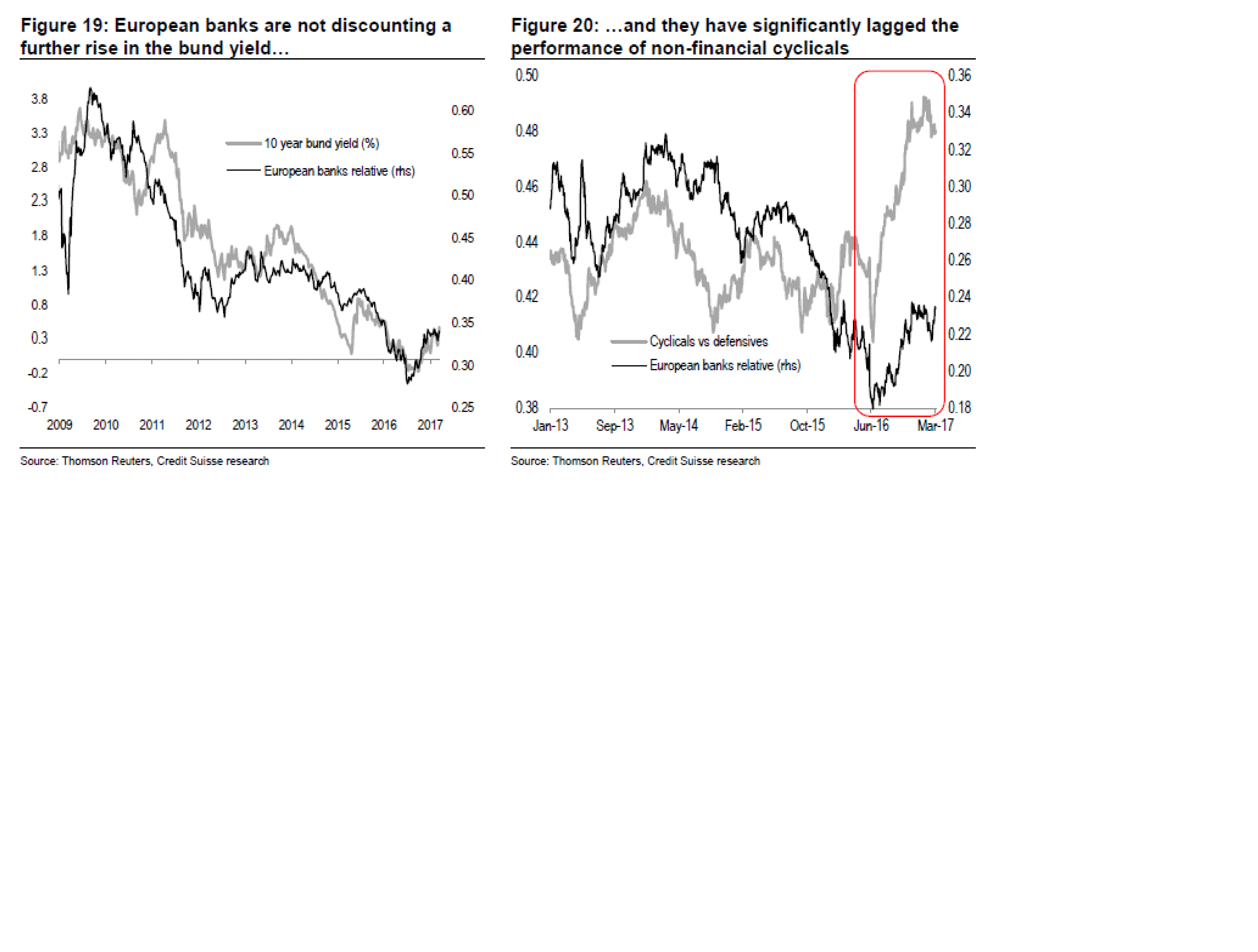 Cykliskt i Europa har gått som tåget. Normalt sett brukar banker hänga på. Samtidigt har inte räntorna lyft vilket korrelerar med bankerna. Så frågan är… antingen är det bara en tidsfråga innan Draghi blir hökig på riktigt och flaggar för räntehöjningar, med stöd av en stark konjunktur, vilket skulle gynna bankerna. Eller kommer inte räntorna att öka, och då kan man ju undra vad som hänt istället, och vad som händer med Cykliskt?