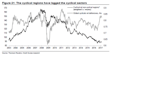En annan rätt kul grej är att cykliska sektorer har gått som tåget, men cykliska regioner, som ex Japan och Europa har inte outperformat. Håller det här i sig, så borde Europa och Japan göra nån typ av Catch upp mot MSCI World. Kort och gott, är du optimist, köp bank i Europa.