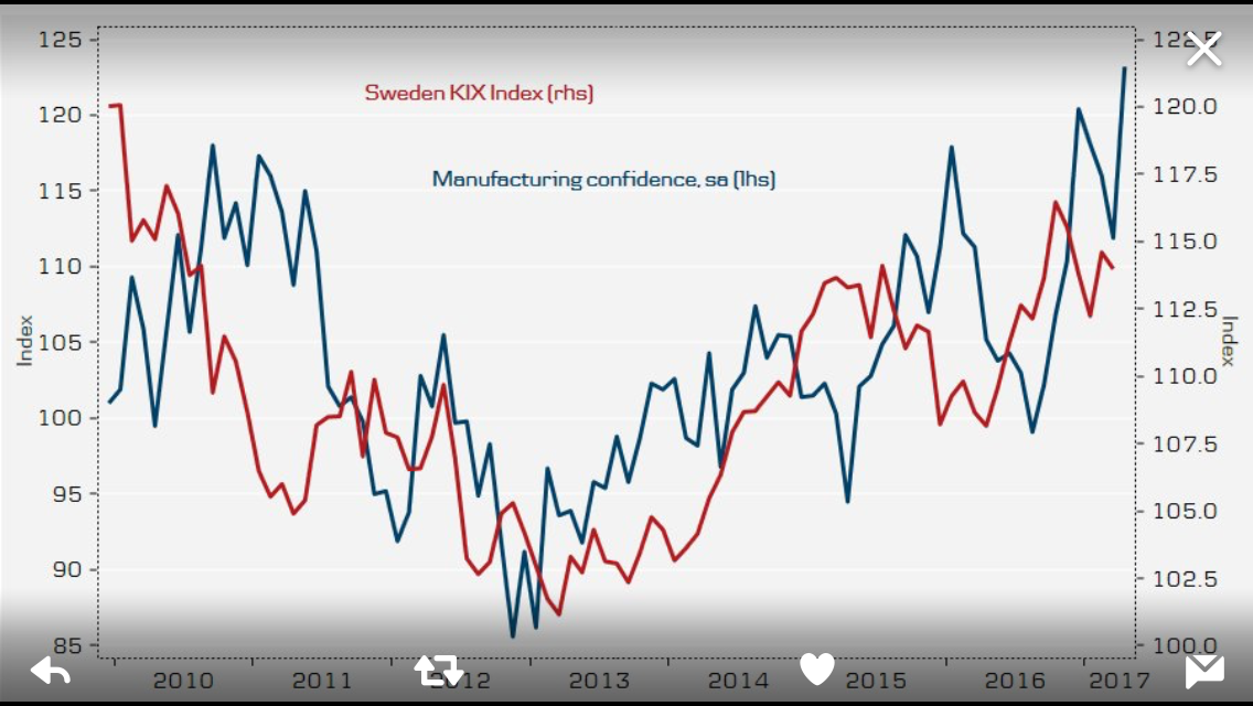 Hade ECB tvärtom flaggat för att man INTE vill förlänga QE och börjat prata om räntehöjningar, då hade Ingves också gjort det. Hade Ingves inte gjort det i den situationen hade kronan försvagats kraftigt mot Euron. Försvagn2ing är bättre än förstärkning men det är fortfarande inte önskvärt. Ingves vill hålla växelkursen där den är. Vare sig mer eller mindre. Han har fog för det. Därför agerade han i samklang med ECB igår. Nedan chart bevisar detta. KIX index visar hur kronan är värderad mot en korg av omvärldsvalutor. Som ni ser så är optimismen i tillverkningsindustrin tajt kopplad till värderingen av kronan. Nedan chart är över perioden 2010-2017. En period som kännetecknas av historiskt svag tillväxt i Europa. I en sånt läge har valutan varit viktig. Dvs om en svensk vara kostar 100 eller 80 euro har varit helt avgörande för en Europeisk inköpare. Nu står KIX index i ca 113. Om Ingves avslutat QE helt i sommar, så är det min gissning att kronan hade stärkts ca 5% i Kix index. Dvs ner mot 108ish. Som ni förstår hade det bildats en enorm spread mellan Confidence och Kronvärderingen, och det hade kanske bara varit en tidsfråga innan det starka förtroendet hade kommit av sig.