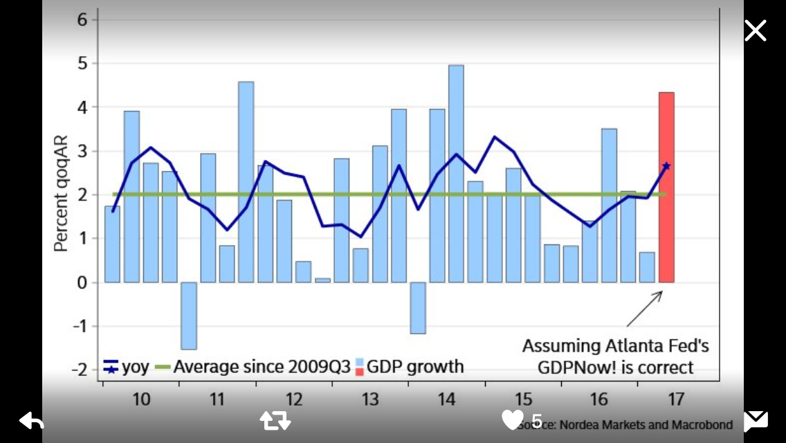 Men låt oss spola tillbaka bandet. Under hösten och efter valet var ledande indikatorer starka och indikerade stark tillväxt. Jobbdatan som trillade in under Q1 i år har varit oväntat svag, sen slutligen kom BNP och den var urkass. Atlanta Fed har en modell som försöker visa var tillväxten ligger i realtid. Det visade att den var spot on, medan ekonomer och inköpschefsindex etc var helt off. Jag skrev några rader om det tidigare. Se chart nedan.