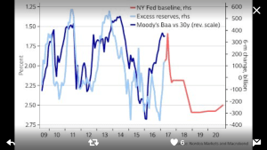 Grovt kan man säga att när FED inleder Qexit, dvs slutar återinvestera de 2,200mdr som förfaller, så bör företagsobligationer spread isär med ca 100 punkter mot idag. Det är vad QE förde med sig. Visserligen skedde en sån tajtning redan mellan 2013 och 2015… i spåren av att Bernanke inledde tapering. Men spreadarna tajtade till sig igen när man inte lyckades strama åt penningpolitiken under 2016 som man sa i december 2015. Givet att man nu lyckas föra den politiken man från början tänkt sig redan under 2015 så är alltså risken överhängande att Credit, dvs företagsobligationer lär spread isär med ca 100 punkter.