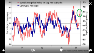 De visar att kronan ska stärkas framöver. Jag tror de stämmer. Alla har varit så glada för att Macron vann, att datan i Europa är stark och Draghi låter hökig. Euron har prisat in detta mer än väl. På andra sidan har vi en duvig Ingves där ingen tycks ta notis om att Svensk ekonomi ändå gått rätt hyfsat, eller rättare sagt, lika bra eller dåligt som övriga Europa. Hur man nu väljer att se det. Jag tror att den här synen kommer normaliseras och då stärks kronan. Varför är detta viktigt? Jo minns ni inflationen häromdagen. Det studsade ju upp från 1,0 till 1,5% och det mesta går att skylla på en svag krona. Om nu kronan börjar stärkas så innebär det att inflationen kommer falla tillbaks. Point being, det finns inget som pekar på att Svensk inflation inte kommer att röra sig annat än i intervallet 1-2% under kommande året.