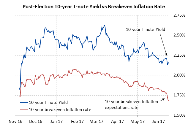 I början av april låg den på 2,6%. Sedan dess har den trillat ner till 2,17%. Samtidigt har FED höjt från 0,50 till 1,00%. Nedan chart visar var den förväntade inflationstakten ligger, något som man kan bryta ur från de nominella och reala räntorna. Den har fallit från ca 2% i april. Dvs marknaden trodde då på att en långsiktig inflationstakt om 2% var inom räckhåll. Idag har den fallit till ca 1,7%. Det låter lite, men det är trenden som är intressant. Marknaden prisar nämligen in sämre tillväxt och sämre tider. Om det har med Trump rabatten att göra, eller att man de facto börjar prisa in slutet av en konjunkturcykel vågar jag inte riktigt svara på. Det kan också vara en kombination då Trump och recession kan gå hand i hand. Svårt att säga.