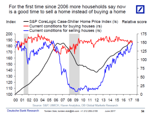 Bostadspriserna i USA ligger generellt nära ATH nivåer, dvs i nivå med 2007. I vissa stater högre, i andra lägre. Men generellt är det så. Kommer de fortsätta att stiga? Vet ej, men det är en rätt ointressant fråga. Frågan är vad nedsidan är? Vi vill inte de ska falla. Just nu är det många som säger att det är superbra förhållanden att sälja. Se graf nedan. Men de sa det för ett år sedan också. Även 2004 sa man det. Tre år innan toppen. så man kanske inte ska dra på för stora växlar av detta. Men man ska ha det i bakhuvudet!